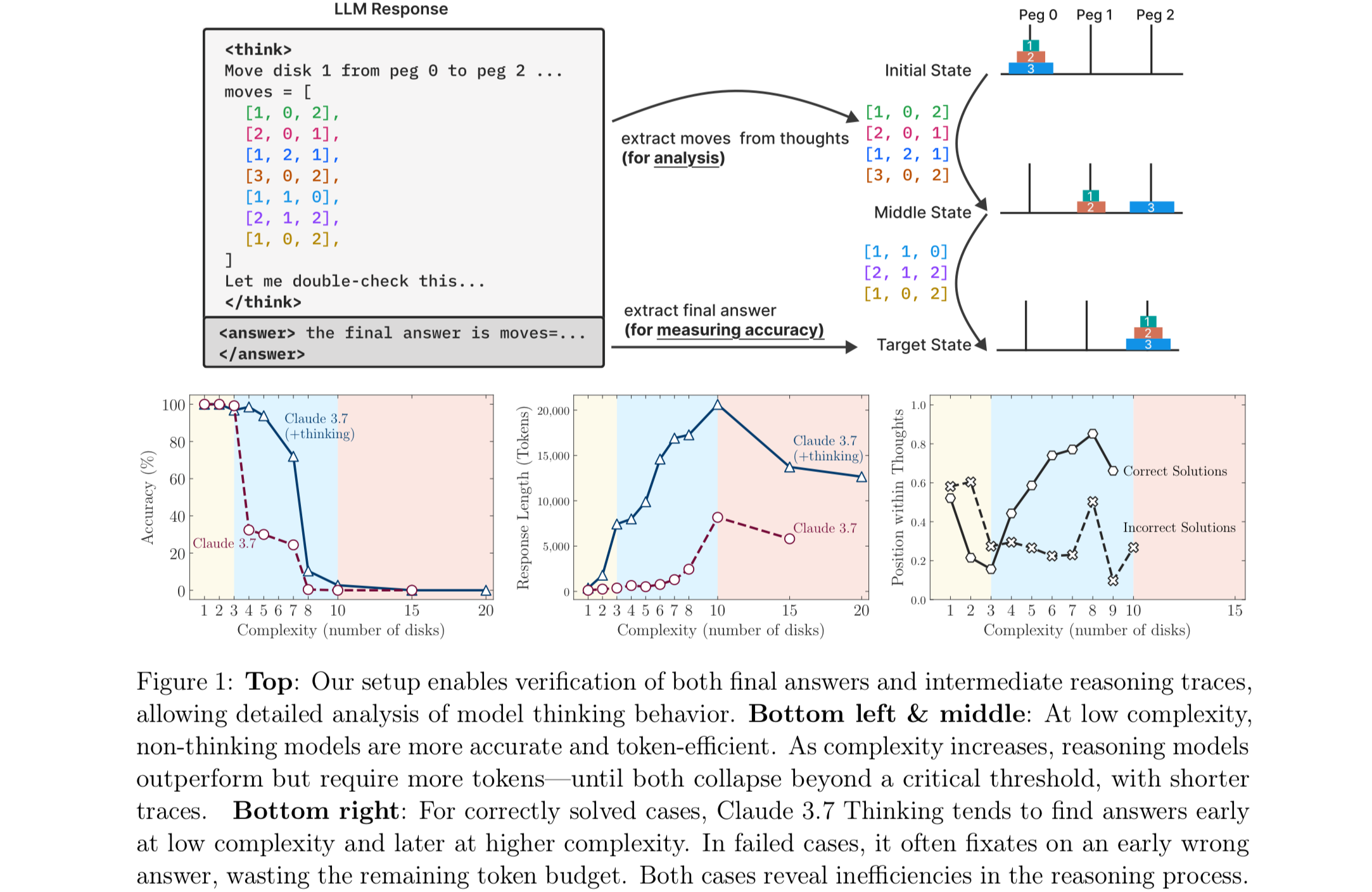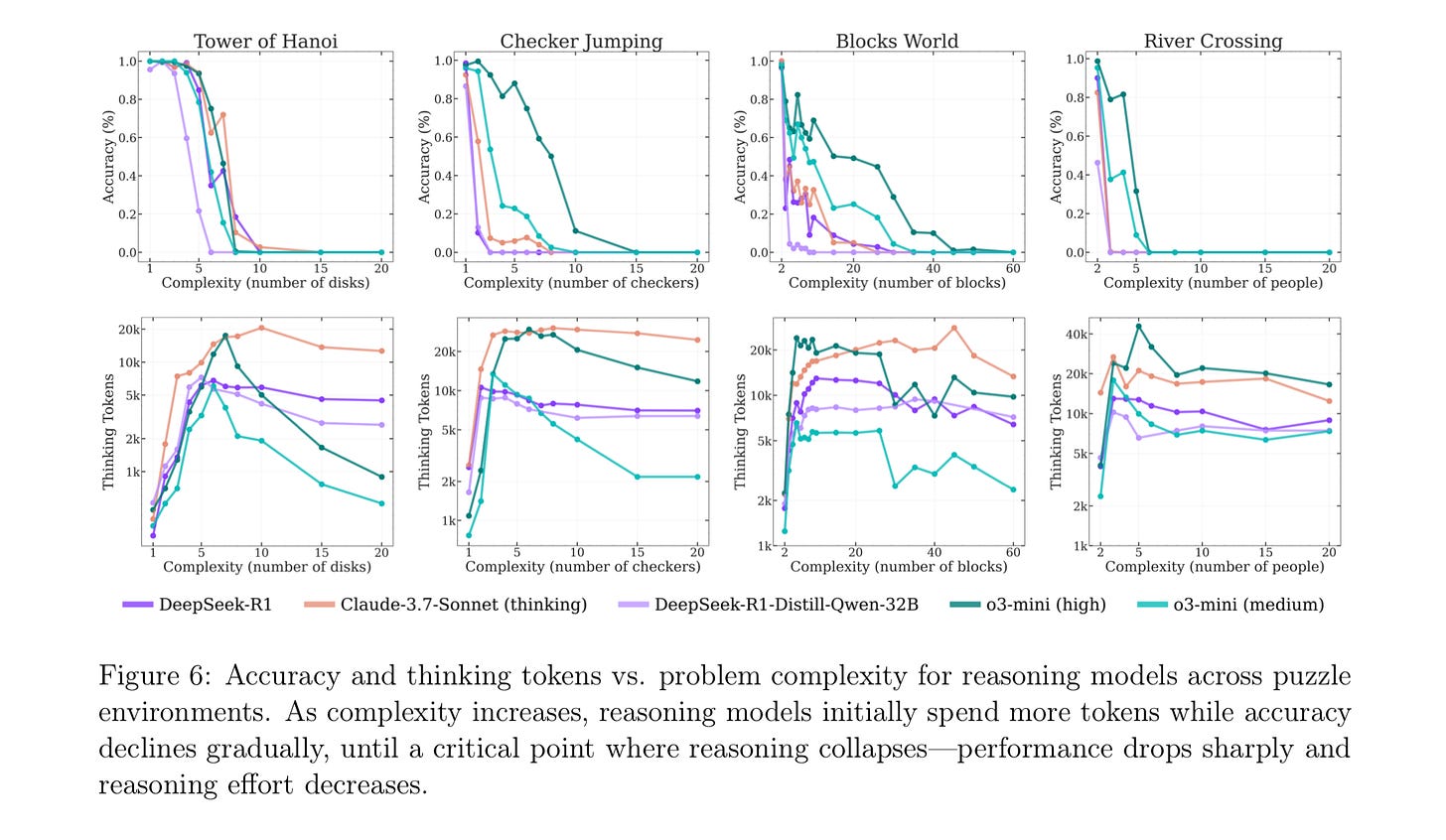 Apple found that the widely praised o3-min (high) was no better (see accuracy, top left panel, legend at bottom), and they found similar results for multiple tasks: