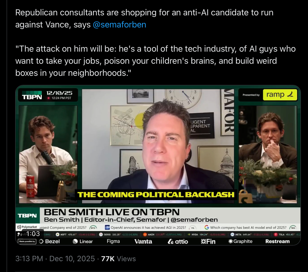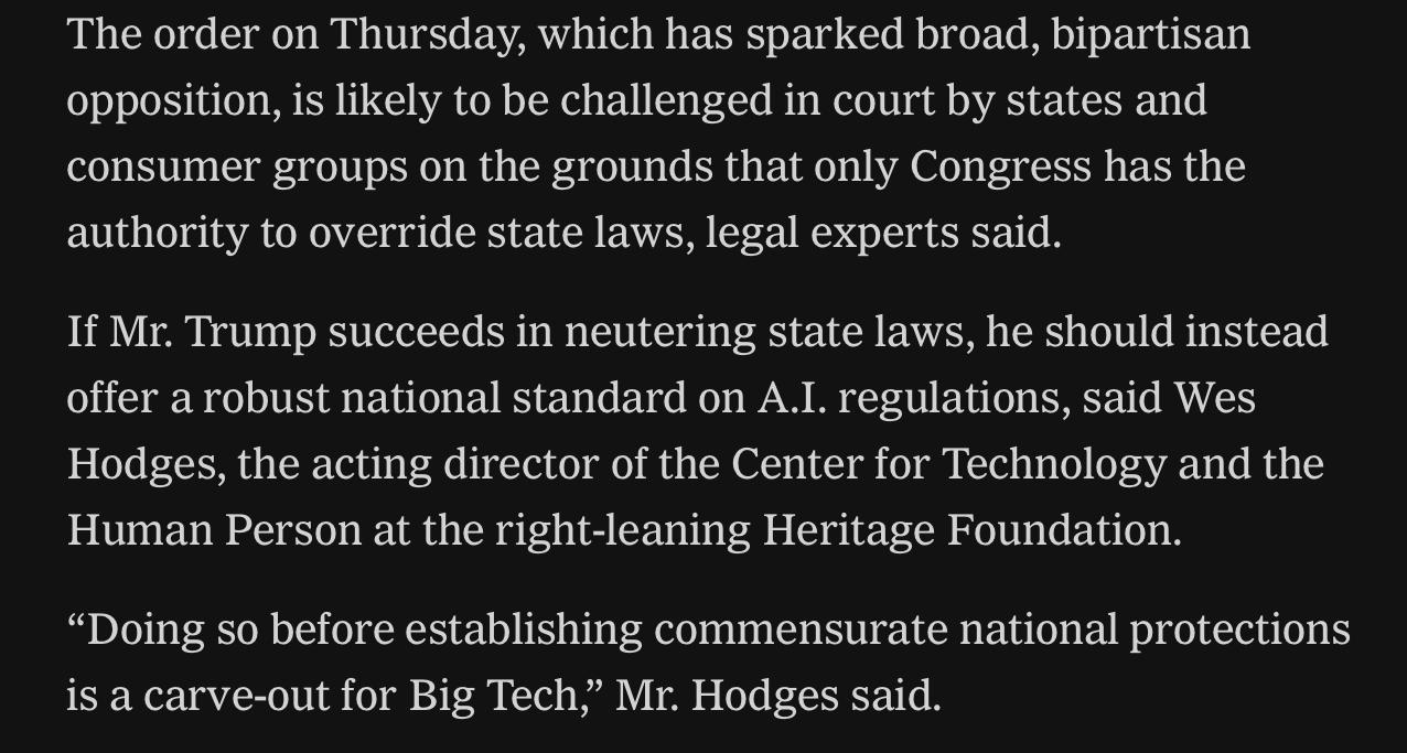 Democratic Senator Amy Klobuchar wrote a scathing critique of what Trump intended to do yesterday in The New York Times, (“State A.I. Laws Keep Us Safe. Trump’s Next Move Could Upend That”), but what is exceptional about this moment is a lot of the far right, from Governor Ron DeSantis to Steve Bannon to Senator Josh Hawley are also strongly opposed.