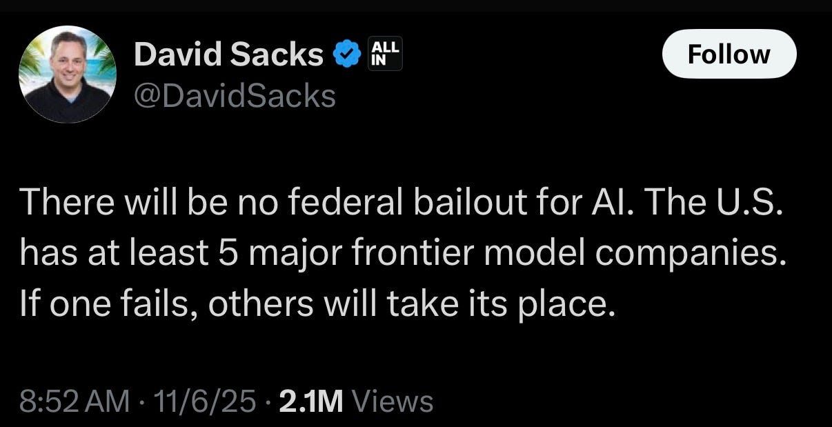 Stay strong, Early November David Sacks, stay strong. If OpenAI fails, Google can readily step in, no bailout required.