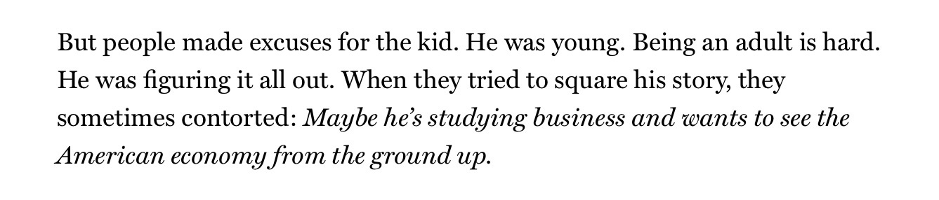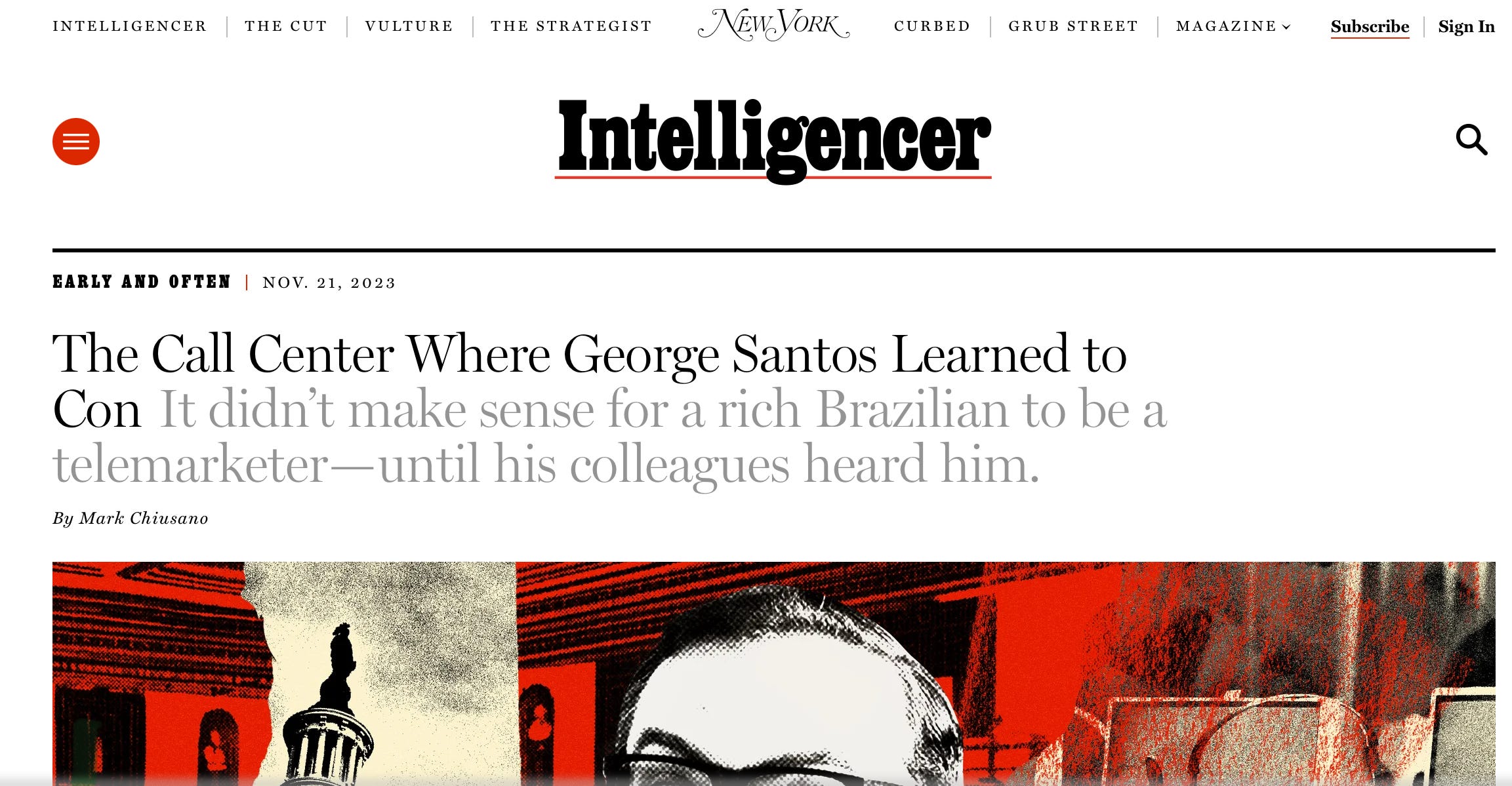 New York Magazine has a fun story on Santos’ origin stories, portraying him as having perfected the art of the lie while working at a call center, selling services to customers that maybe didn’t really need what he was selling. It’s a tell of avarice.