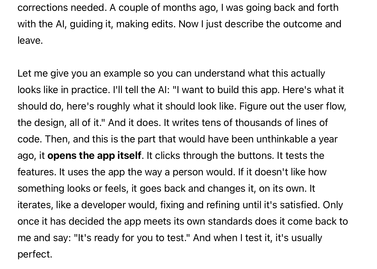 To his credit, Shumer is actually correct that something has changed recently. You really can let things rip more in the most recent systems. But he misses something subtle but essential, captured well by a friend who very skilled in the art of coding pointed out to me. After reading a draft of this essay, he texted me