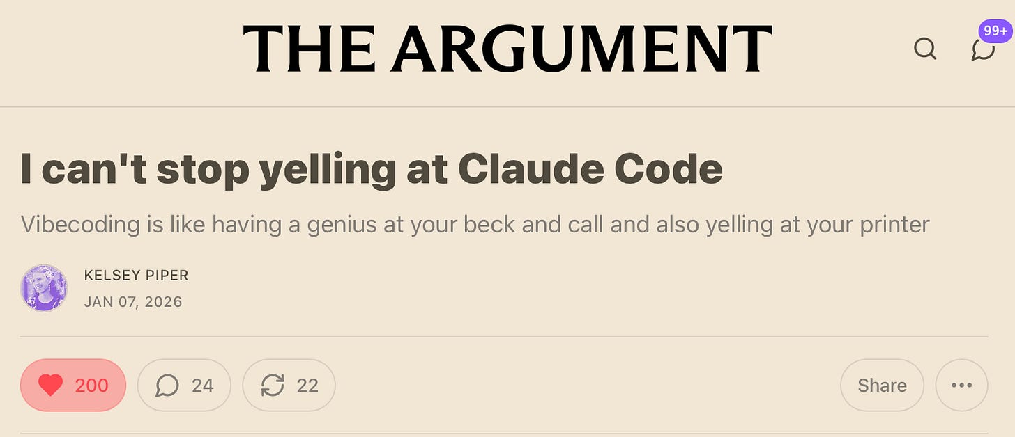 He also didn’t acknowledge that other user’s experience is certainly not “it’s usually perfect.” Take the often AI-optimistic Kelsey Piper who reported a few weeks back that Claude Code was sometimes perfect, and other times maddening. (Example: “Sometimes, Claude is absolutely the worst coworker you’ve ever had. At one point, it deleted every single one of the phoneme files of each English sound pronounced [that she was working with in her app] absolutely correctly, which I had personally emailed an English teacher to secure permission to use, and replaced them with AI-generated sounds which were all subtly wrong.”) Shumer glosses over that kind of experience.