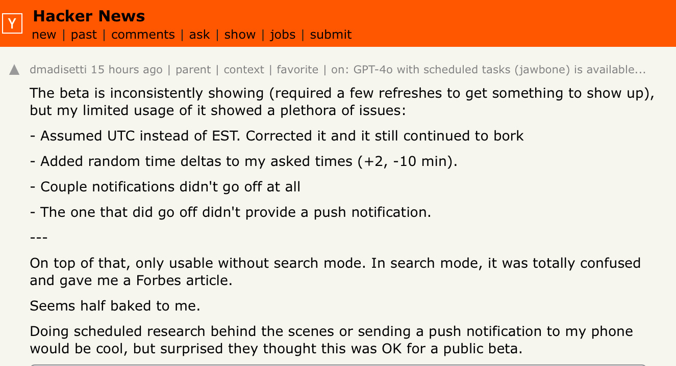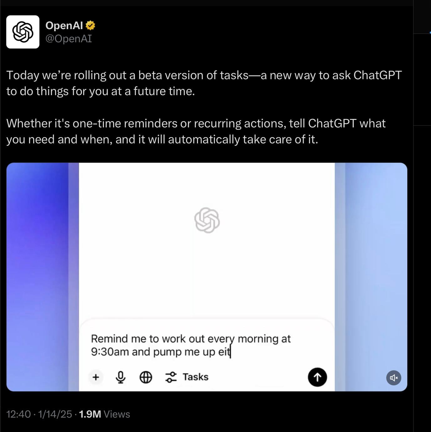 One of the first demos, a very minimal agents was released yesterday, was OpenAI’s “task” system that lets you schedule ChatGPT actions, a far cry from being able to do literally anything you might ask.
