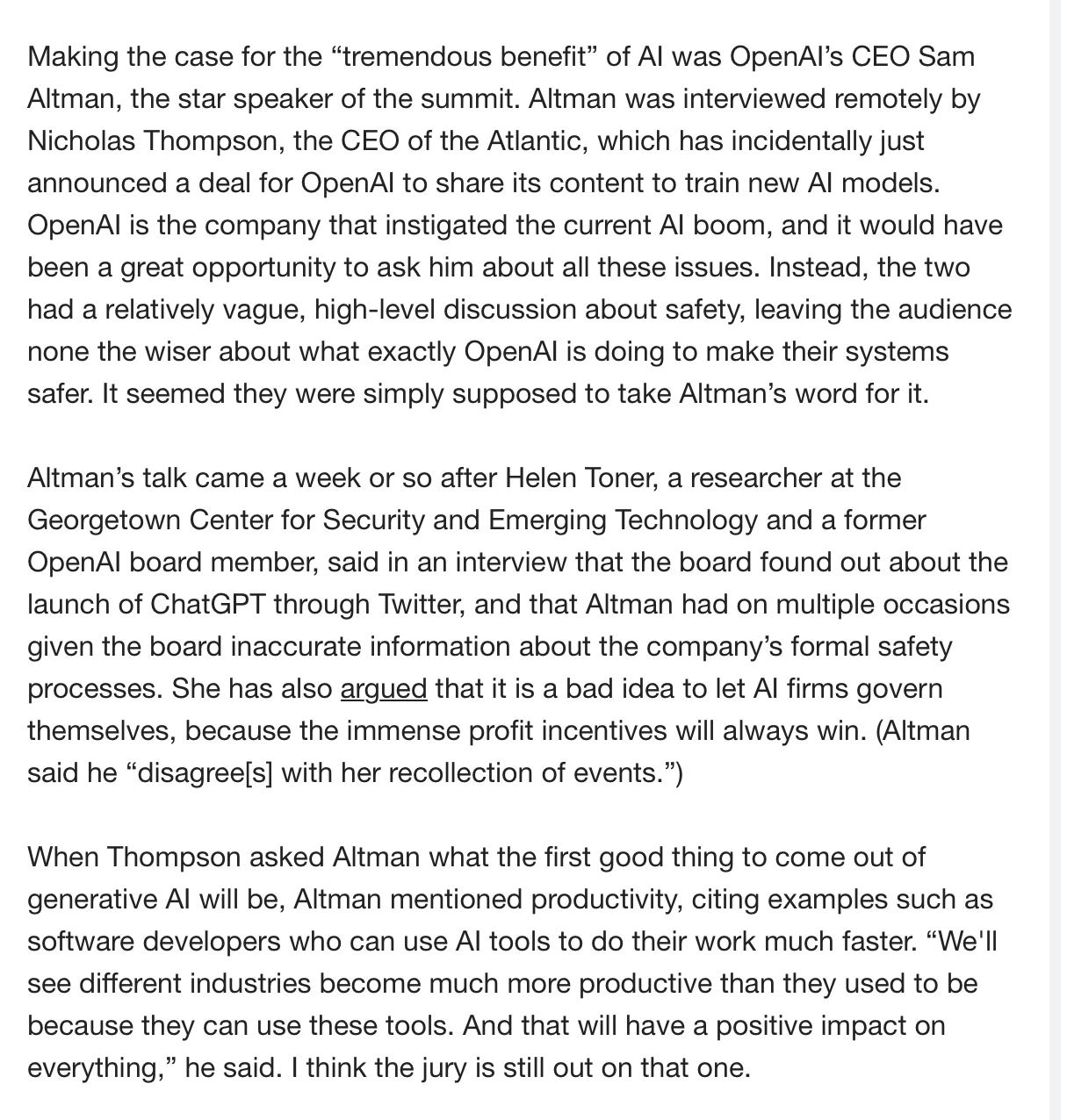 • Melissa Heikkilä at Technology Review more or less panned Altman’s recent fireside chat at AI for Good,