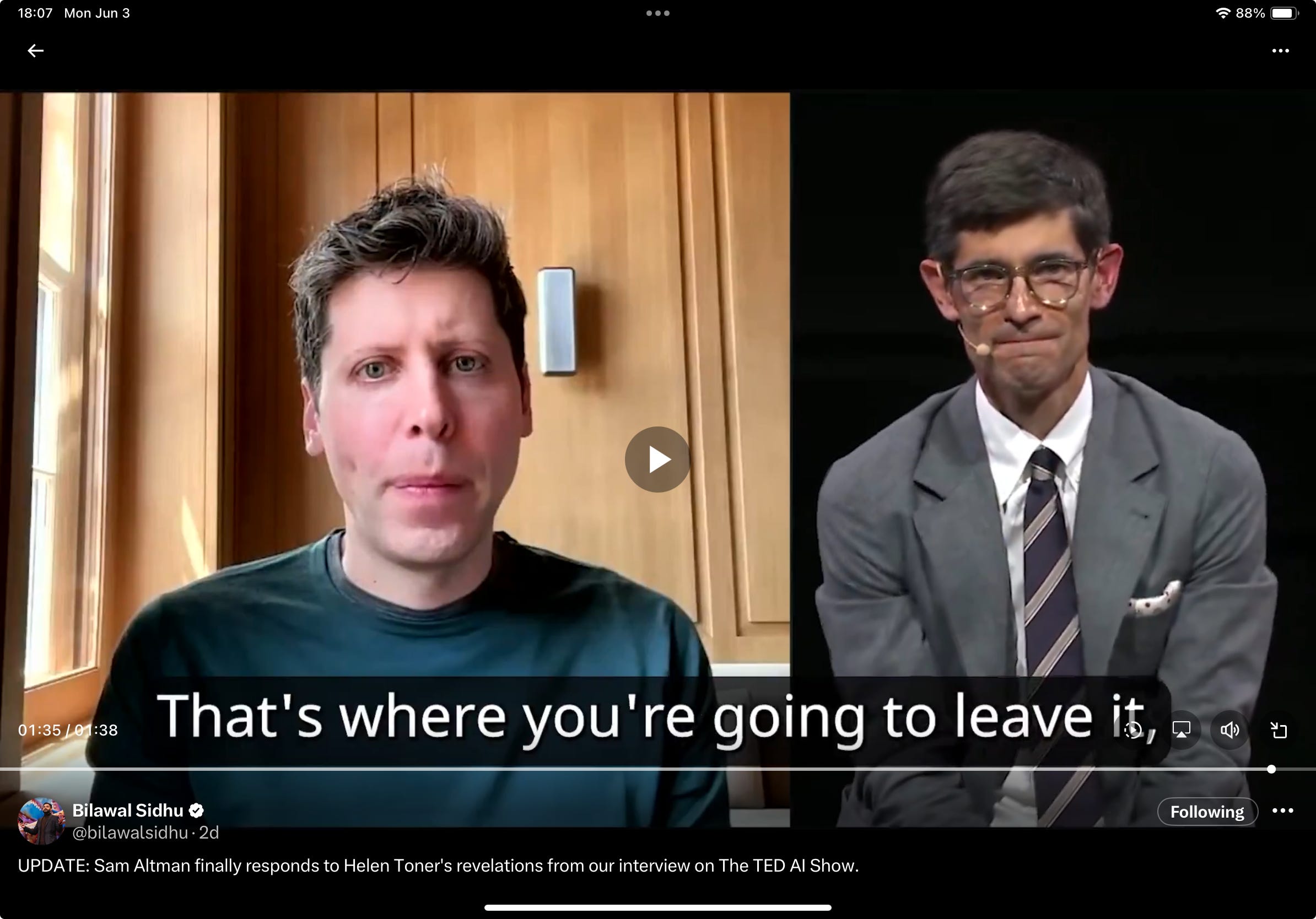 • For bonus points, watch his eyes when he discusses Scarlett Johansson. As one person on X put it, “What I hear is someone that has a hard time with the truth.”