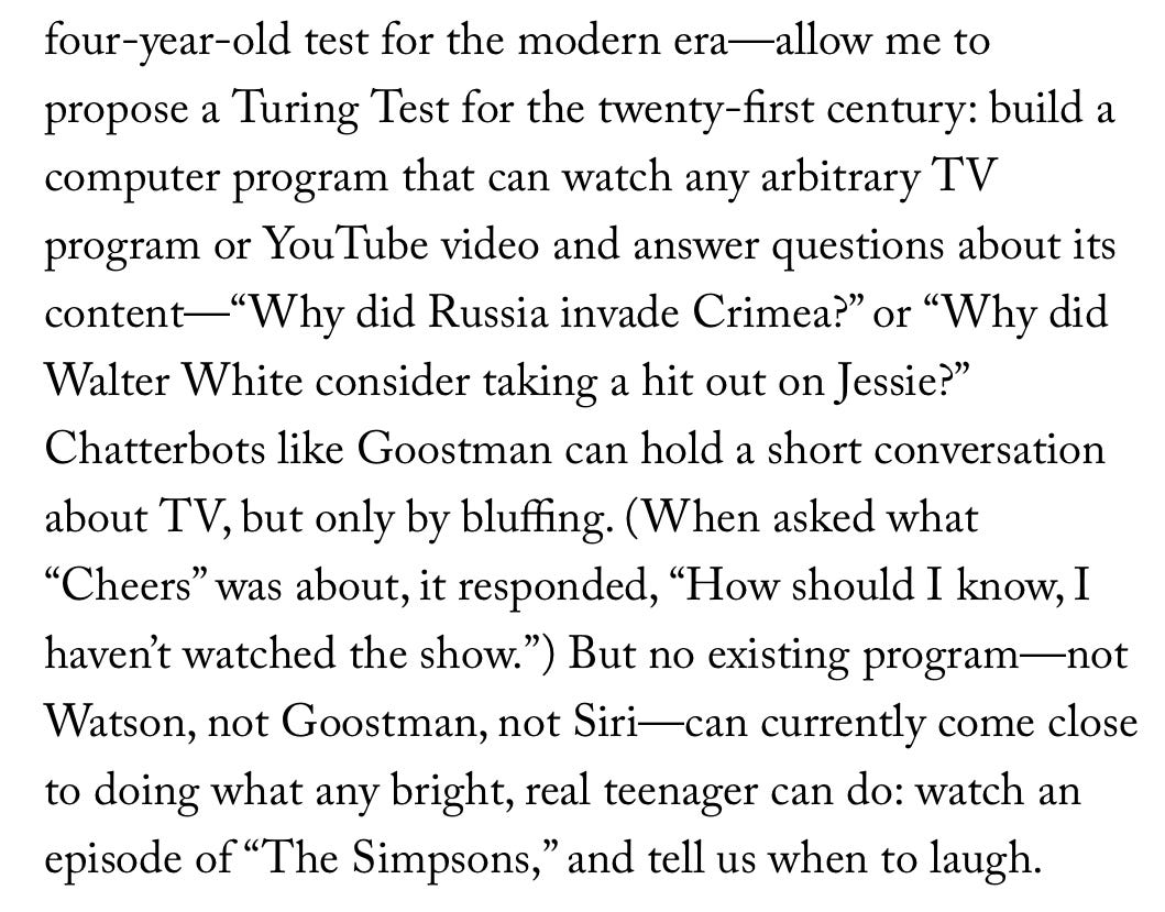 When I see that, I will be genuinely impressed. (Systems like Gemini can do this a little, but often hallucinate heavily, and don’t think as yet they can take in a full Simpsons episode, let alone follow 4 seasons of Succession and explain who is lying to whom and to what end in real time.)