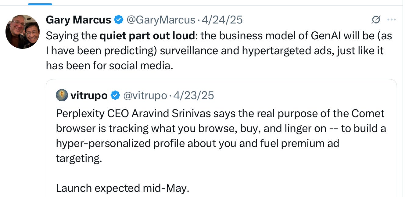 Things have taken a severe turn for the worse, and it’s not just that it was reported last month that OpenAI now trying to launch a social media network, presumably in part towards the end of collecting further private data. Or that Perplexity’s CEO recently just said the quiet part out loud: