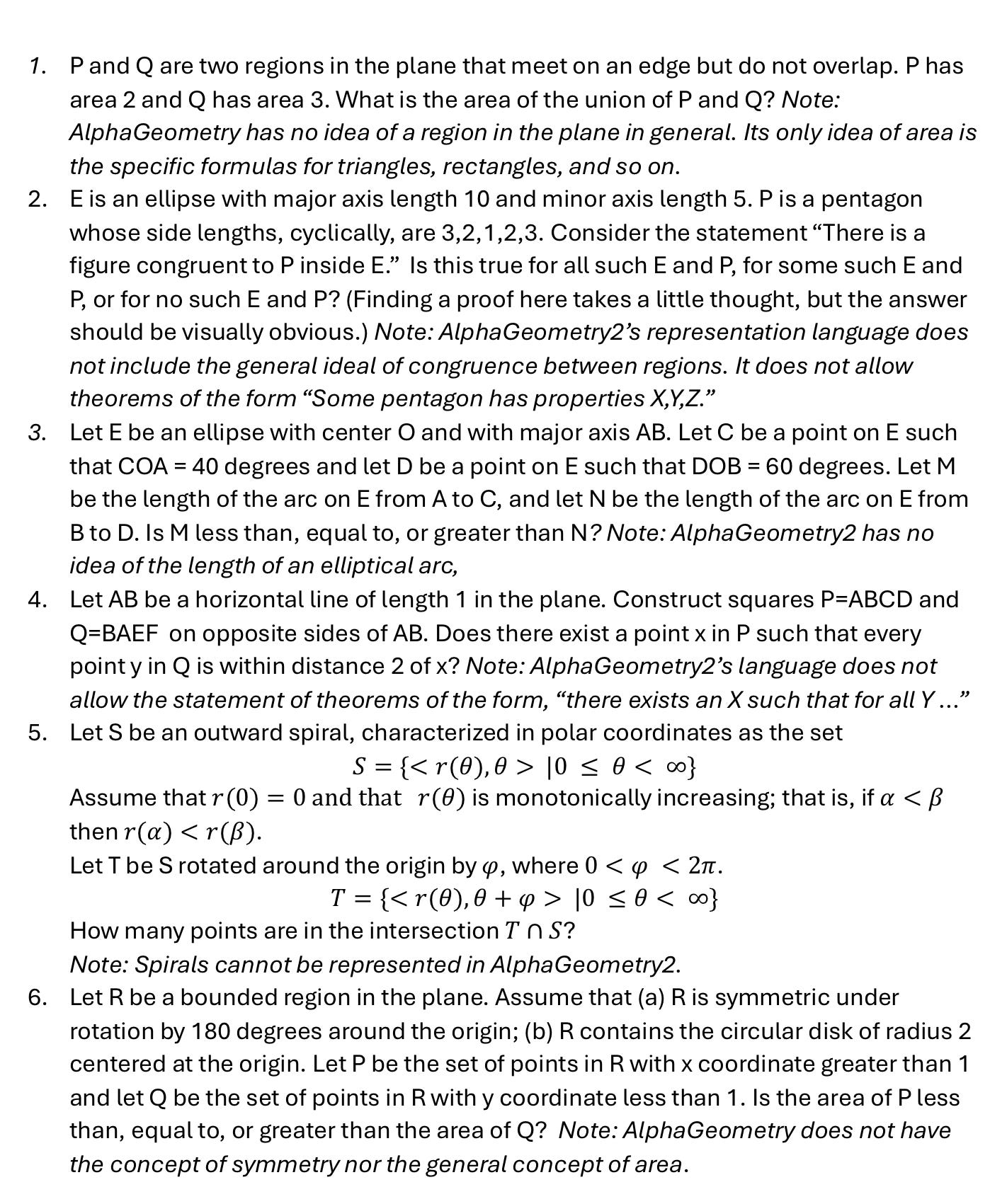 We are not, by any means, claiming that no AIs can handle the six problems above. On the contrary, ChatGPT can certainly answer problem 1 correctly, and might well be able to answer some of the others. But chatbots like ChatGPT have their own, different, huge gaps in their understanding of geometry and of their ability to do geometric reasoning. Even if one were to glom together the best general AIs with AlphaGeometry2, the combination would fall far short of the geometric understanding and problem solving ability of high school math student with a talent for math.