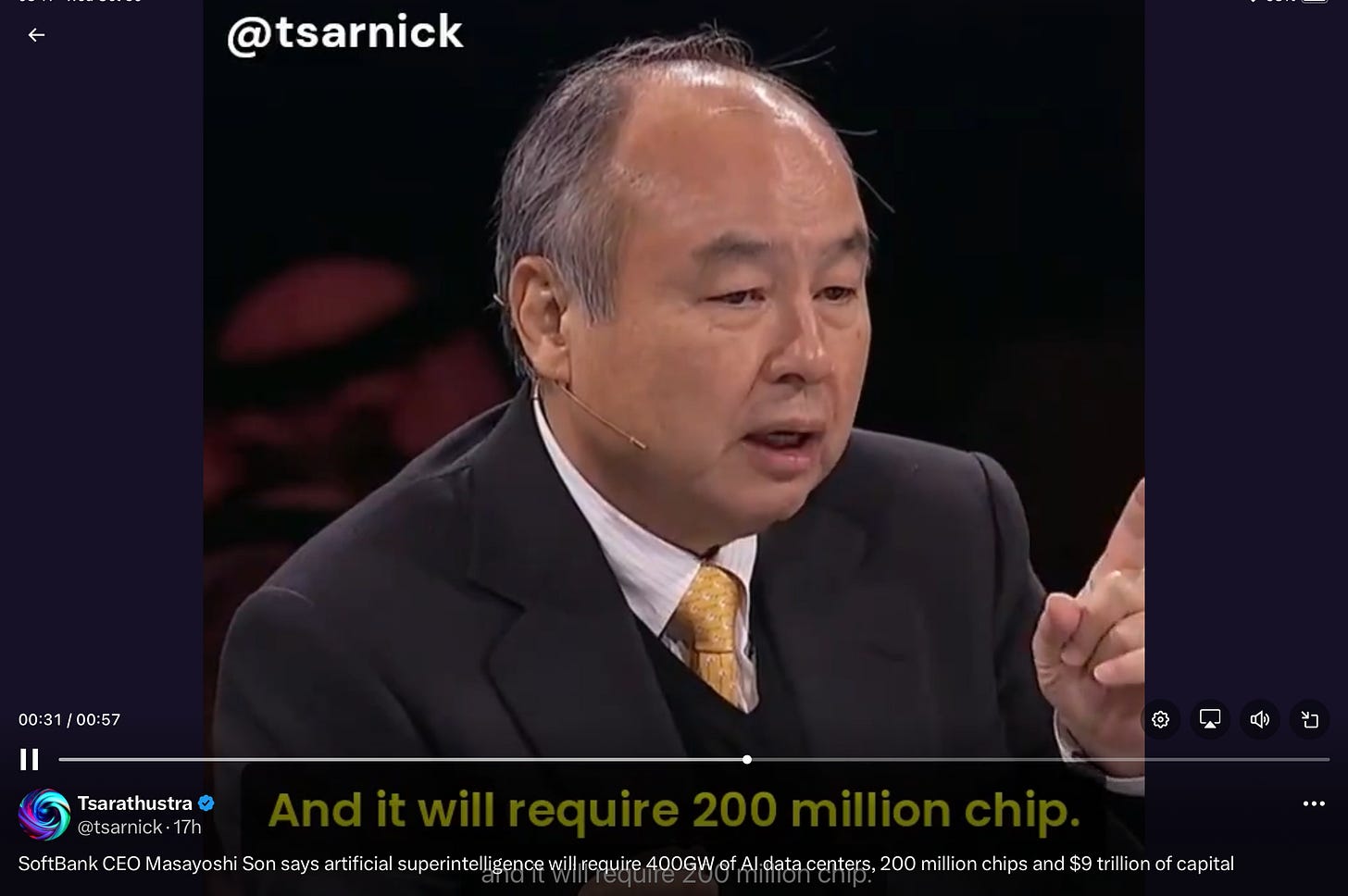 An hour later, I saw that on the same day, at the same event in Saudi Arabia, Son, riffing on his own 10,000x number1 that he introduced a moment earlier, had actually achieved a trifecta of weirdly precise statements about things are impossible to know with precision all in one go, forecasting that it would require 400 gigawatts, 200 million chips, and $9 trillion capital.