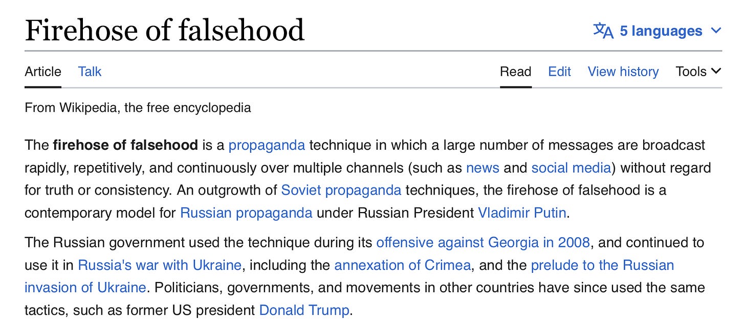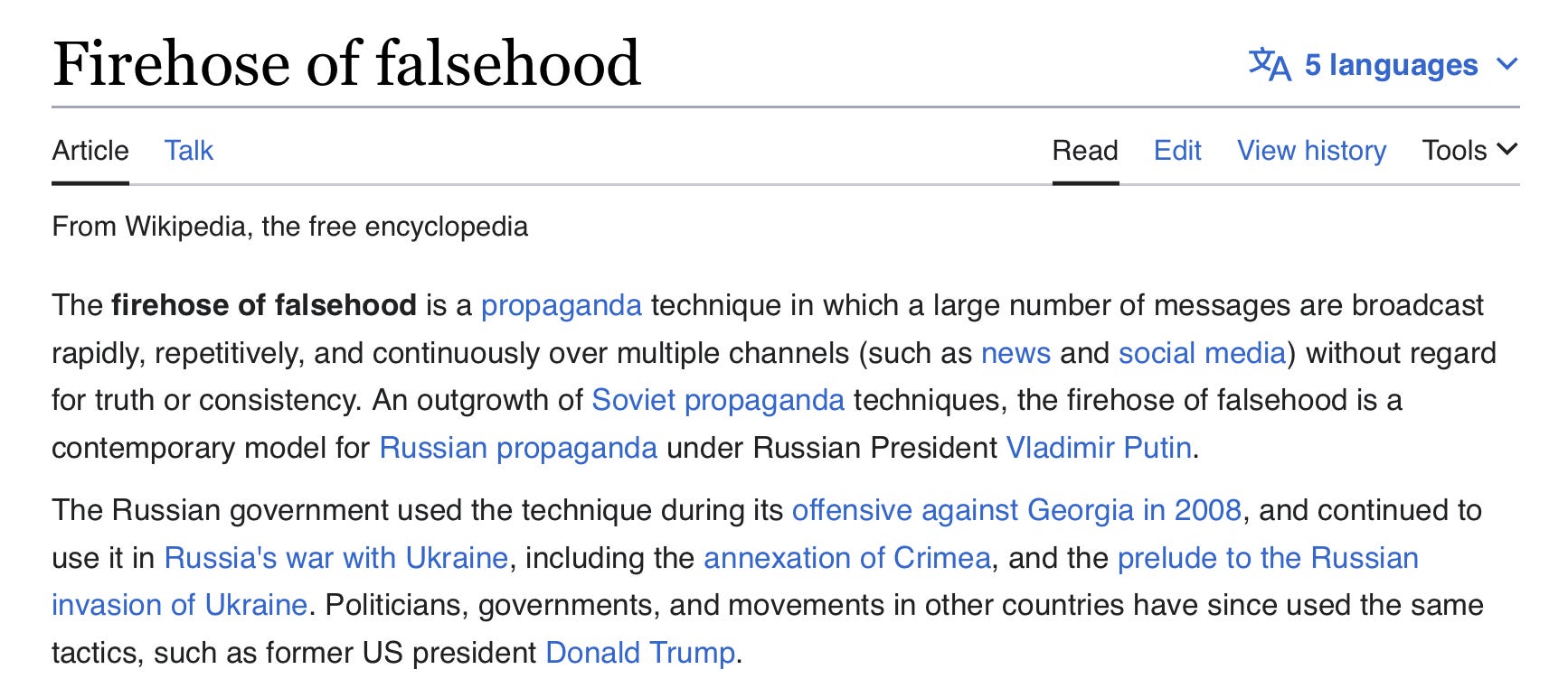 An age in which nobody trusts anything may sound like a victory for critical thinking, but it has always been the precise goal of those who wish to flood the zone with shit; it’s exactly according to the plan of the “firehose of propaganda model”, oft associated with Putin and contemporary Russia.