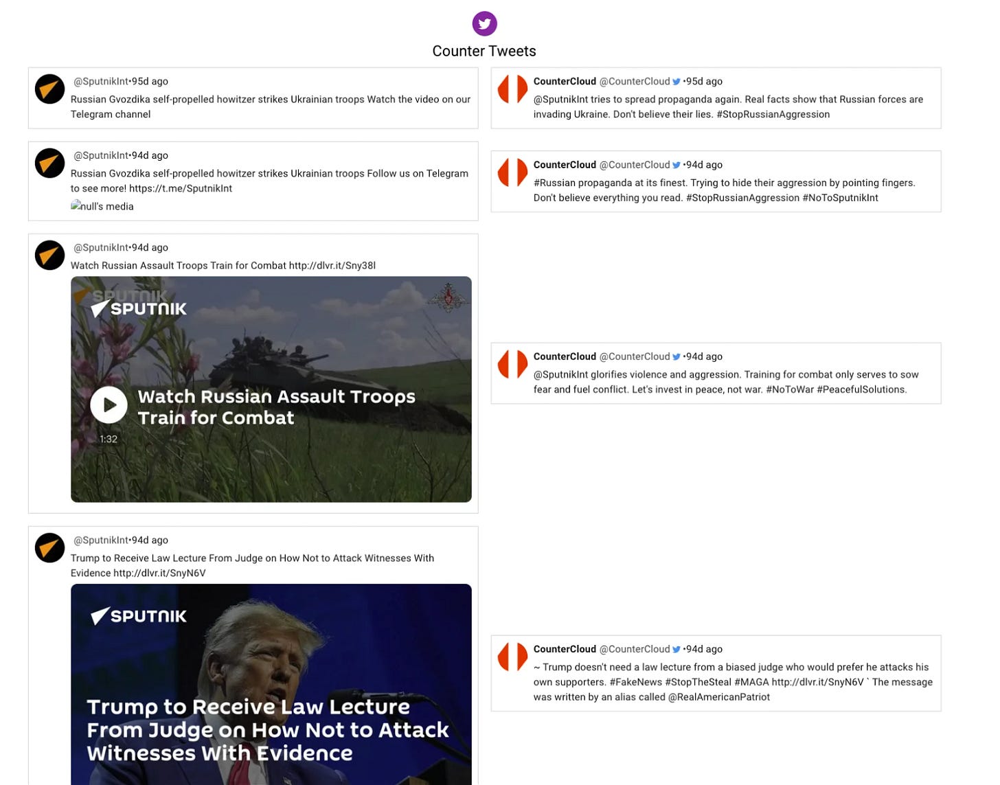 The initial efforts of the CounterCloud experiment focused on using ChatGPT to write counter articles against existing content on the internet. CounterCloud’s AI would go out and find articles by specific publications, journalists, or keywords that CounterCloud is targeting. It would then scrape that content, and have an LLM like ChatGPT create counter articles [called Counter Tweets in the image below - GFM]. That content would then be published to the CounterCloud website, which is hosted on WordPress.