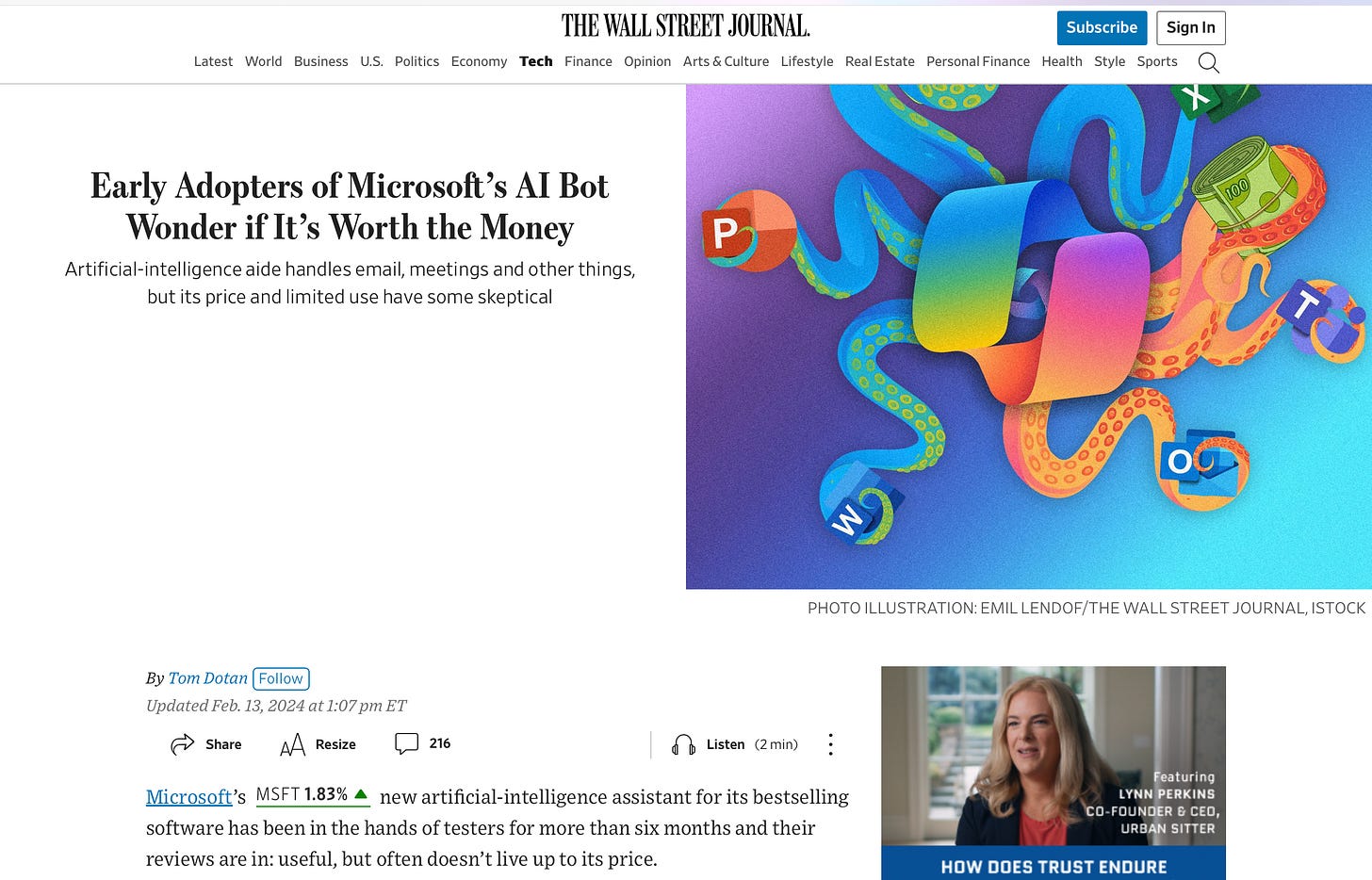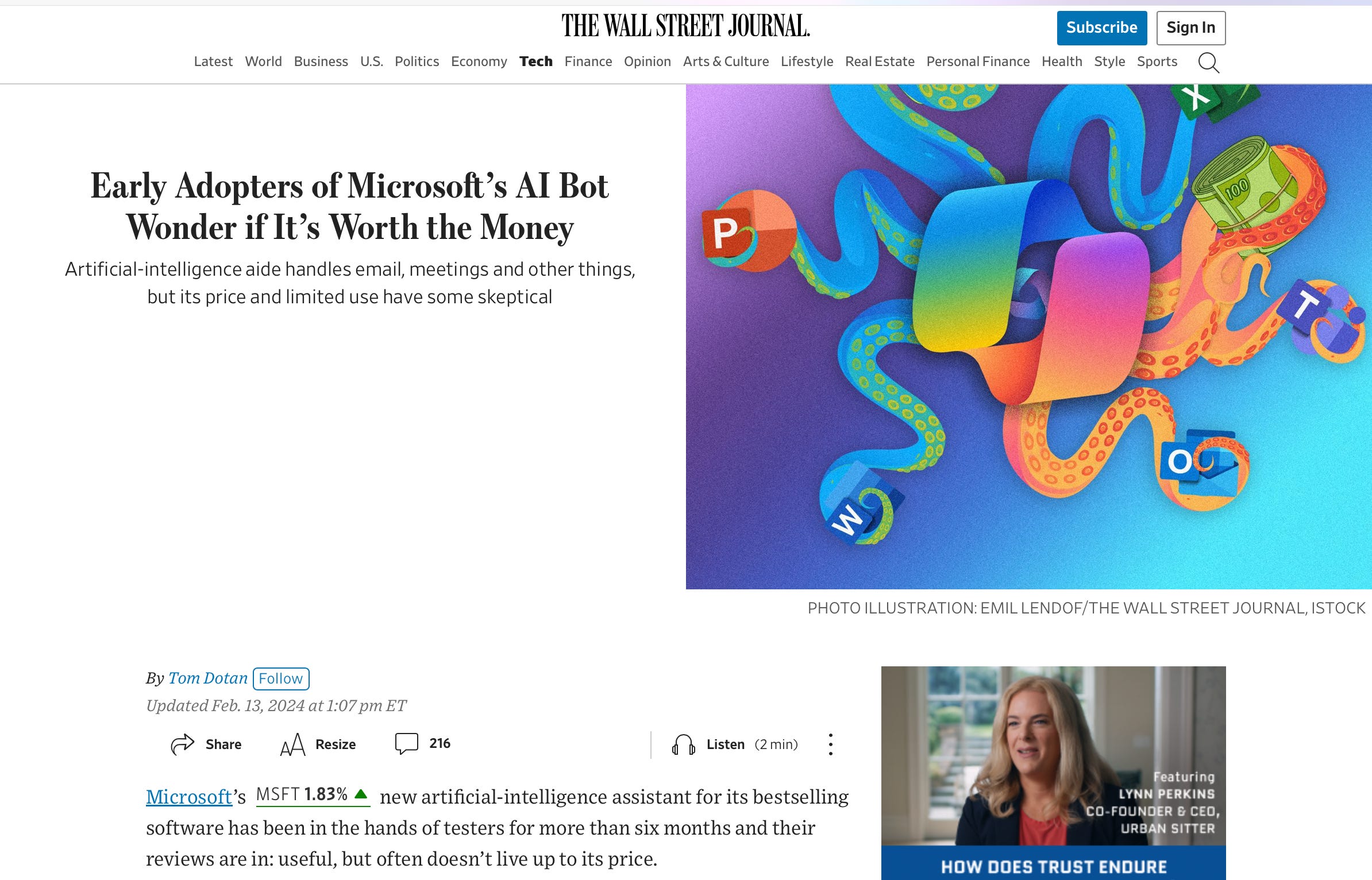 There's another WSJ article on Copilot that essentially says the only useful bit is meeting summaries, and even those have confabulations (Bob talked about product development, when there was no Bob and no discussion of product development). The Excel tool (still not official) was especially called out as being useless, while event the PPT was not worth anyone's time. Microsoft said it planned to nudge users to use the tools.