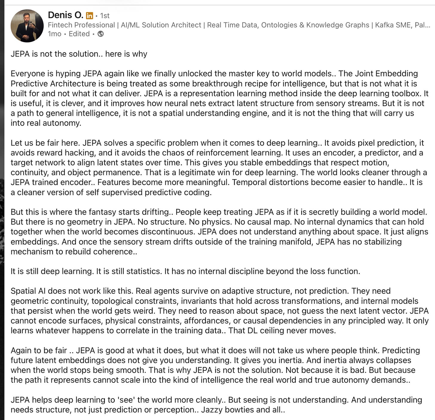 A smart though technical post at LinkedIn from Denis O. a month ago, reprinted below, stated the situation extremely well. If you don’t follow the technical jargon, you can just skim, and focus especially on the part about what JEPA is — and is not: