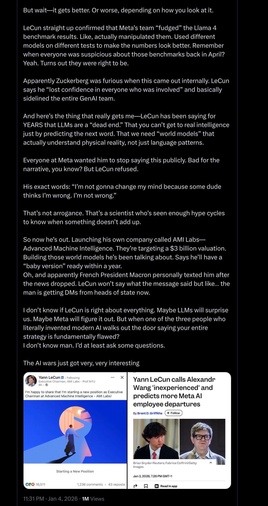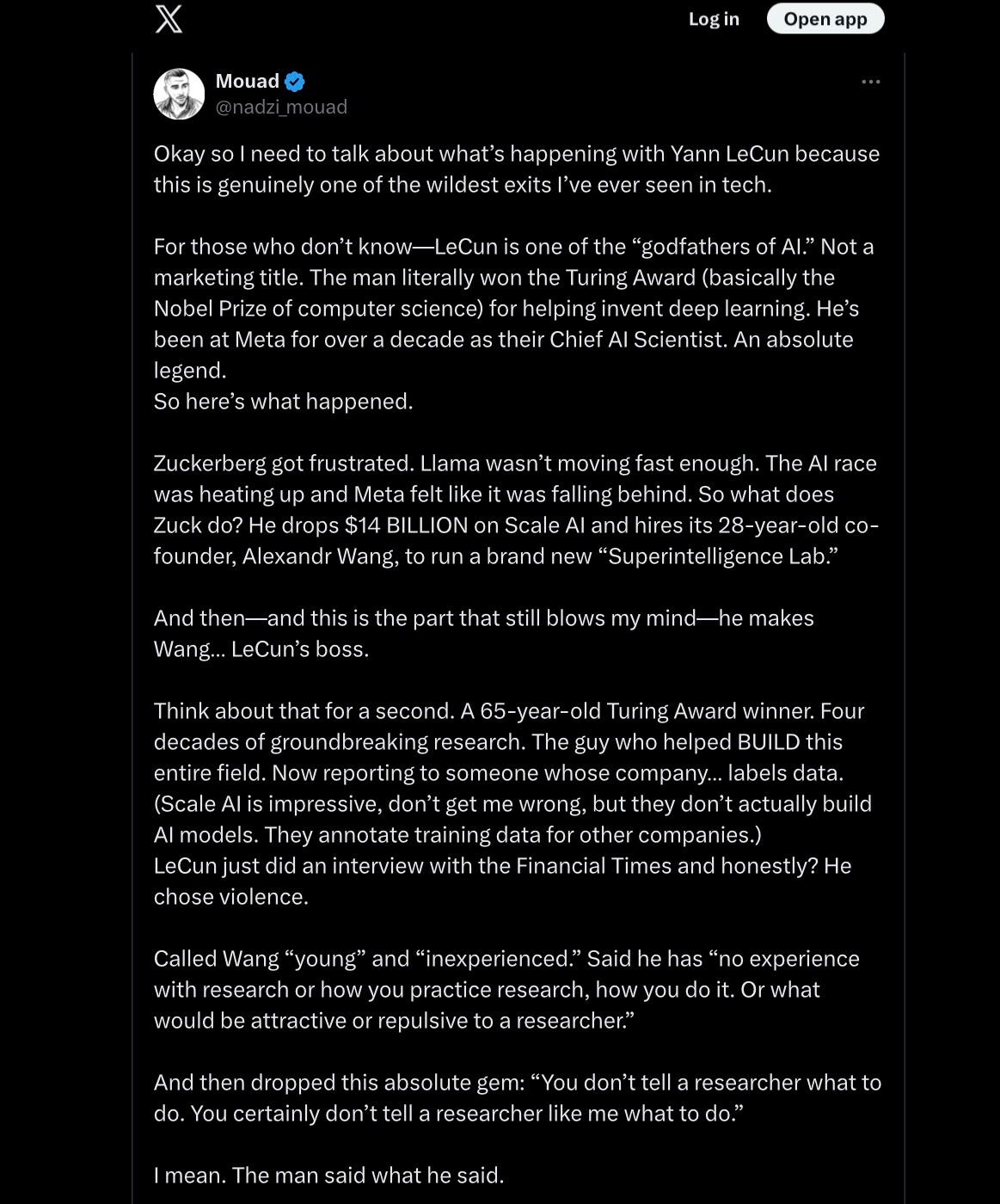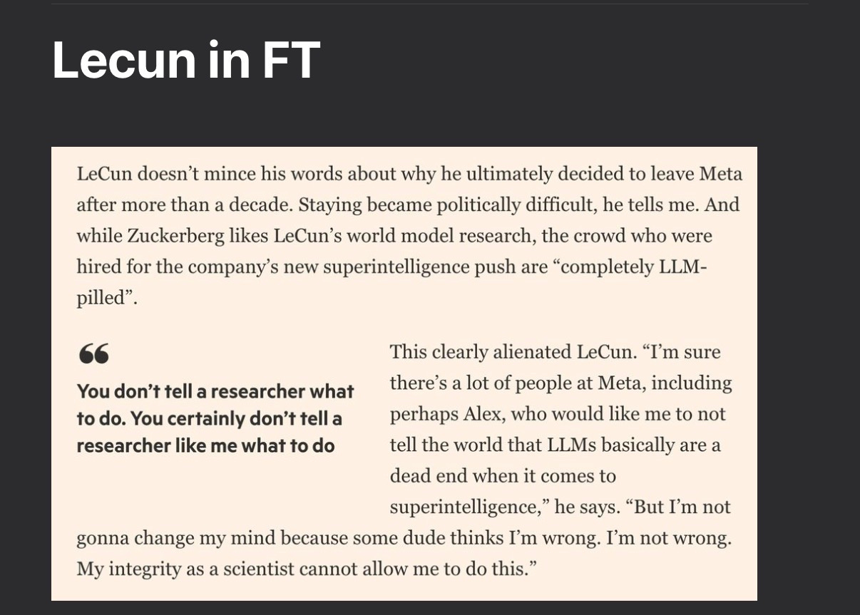 More power to LeCun for standing his ground. Zuckerberg doesn’t know more about AI than LeCun does, and Wang doesn’t either. Furthermore, what LeCun does best is research. He may not be as original as he pretends to be, but he (mostly) has good intellectual taste, and someone like Wang, known mainly for a somewhat “sordid” data collection company rather than any particular technical vision has no business telling LeCun what to think.