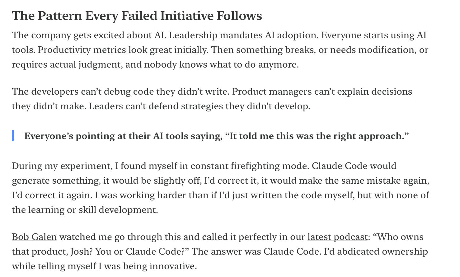 A recent Substack on using LLMs for coding from Josh Anderson beautifully captures a common pattern of enthusiasm followed by disillusionment: