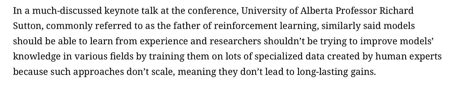 Rich Sutton’s keynote also expressed serious concerns with the current approach:
