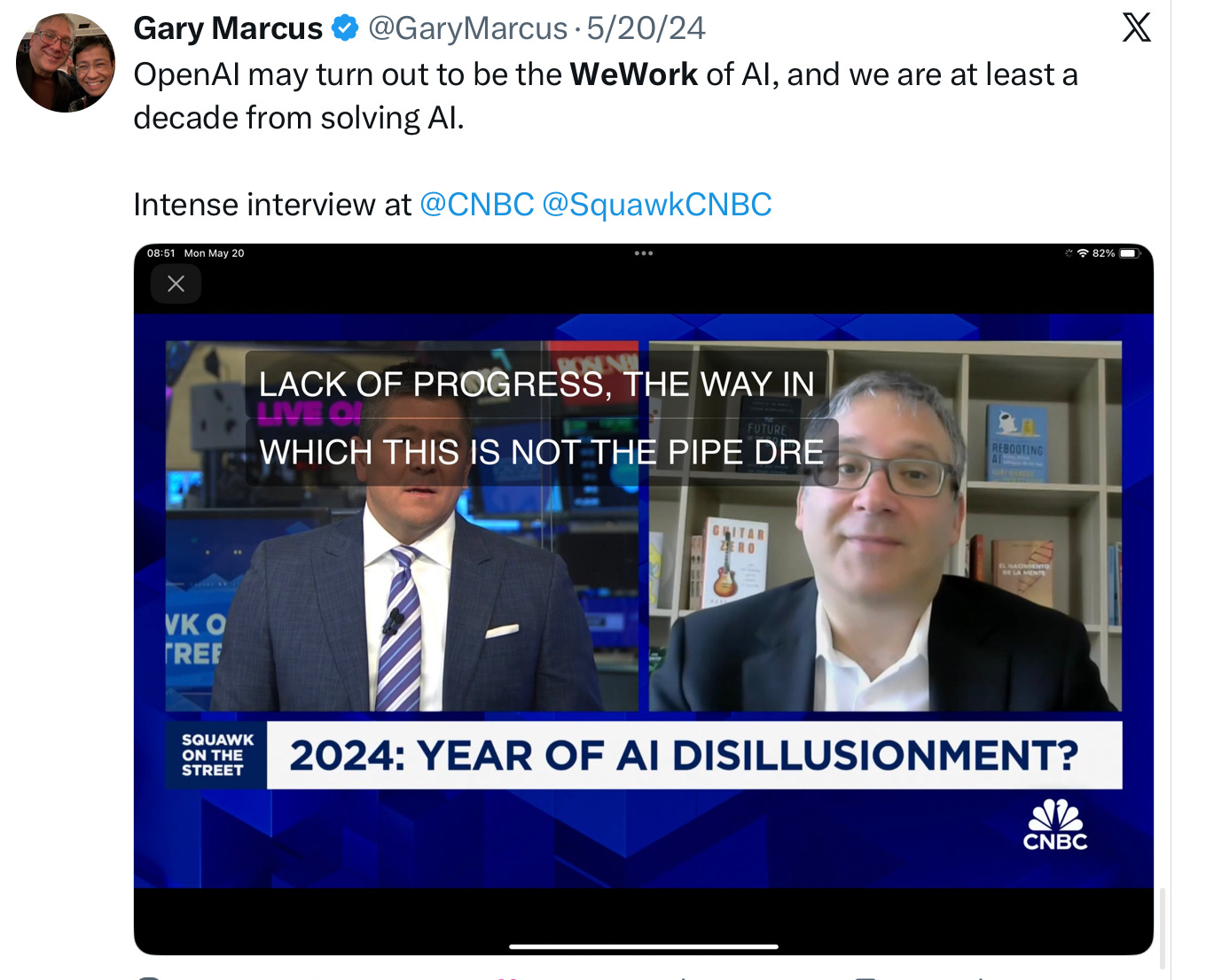 Will OpenAI someday be seen as the WeWork of AI, as I have suggested several times, as far as back as late 2023? I still think so, and I think that moment is drawing close. They have, by any reasonable standard, seen rough times of late. Google and Anthropic have each largely caught up; various Chinese companies are closing in. More and more questions are being raised about their financing. (And more and more people are agreeing that AGI won’t arrive this decade).