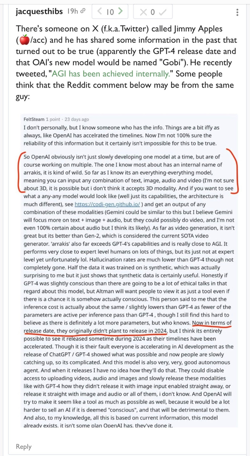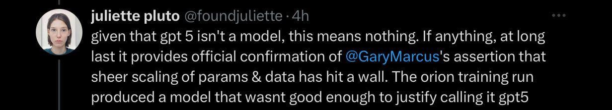 First, Orion – OpenAI’s last great effort at pure scaling – has failed. We can infer that they want to ship it, now, because they can get no further with it. But we can also infer that they don’t want to call it GPT-5 — presumably because nobody would take it seriously as AGI. If they called Orion GPT-5, reactions would likely converge for many on “is that all there is?”. OpenAI’s mystique might well take a serious hit. The company’s future rests on them doing something truly revolutionary, and Orion turns out not to be that.