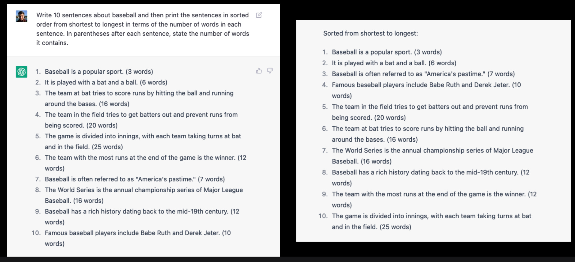 As a last example, consider the following, where it initially sort of seems like ChatGPT has understood both counting and sorting in the context of complex query—which would be truly impressive—but on inspection it gets the details wrong, because it is relying on similarity, and not actually inducing the abstractions that define counting or sorting.