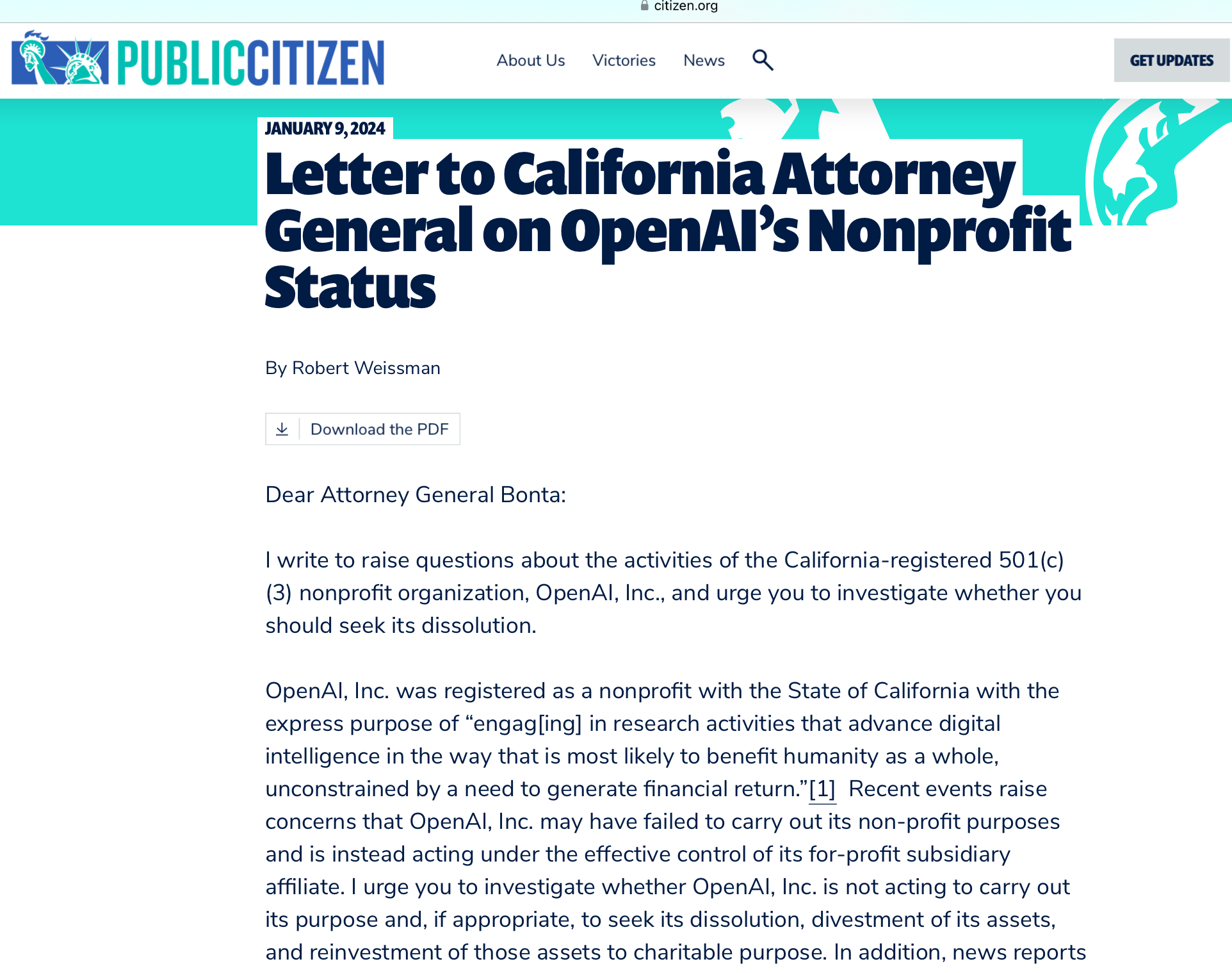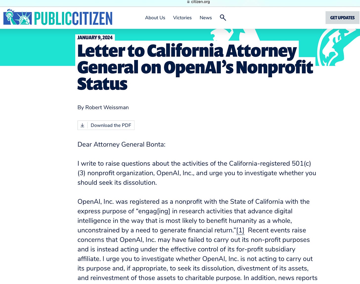 Big news today, via Stephanie Palazzolo at The Information: the group Public Citizen yesterday petitioned the state California to reevaluate OpenAI’s nonprofit status.