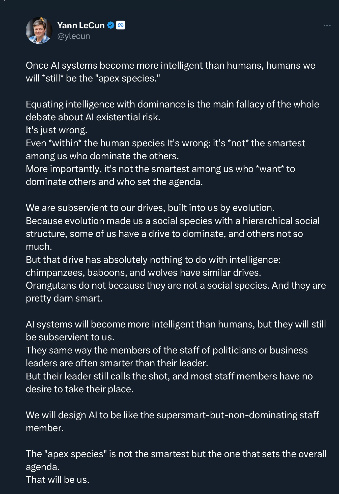 Another common argument is to say that there is no reason whatsoever to expect AI to control (or annihilate) humans. Yann LeCun wrote a long screed along these lines (which Steve Pinker later endorsed), saying we donāt need to worry about AI achieving dominance. Some of what he says is right, but thereās a fallacy here, too. LeCunās premise that the smartest doesnāt always win is of course right but his argument as a whole sputters out in the end:
