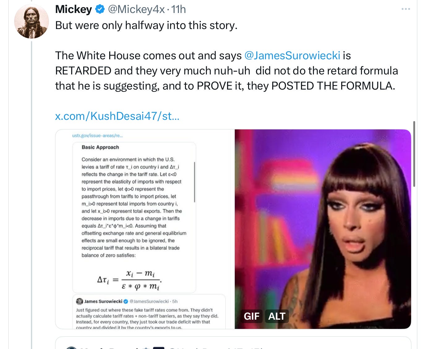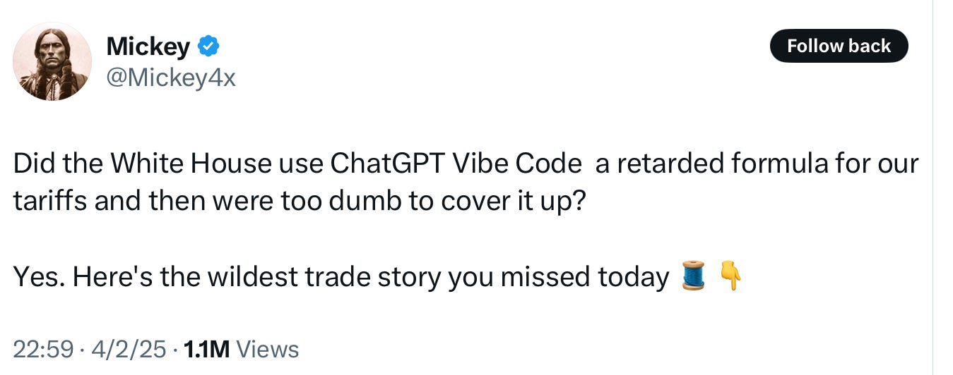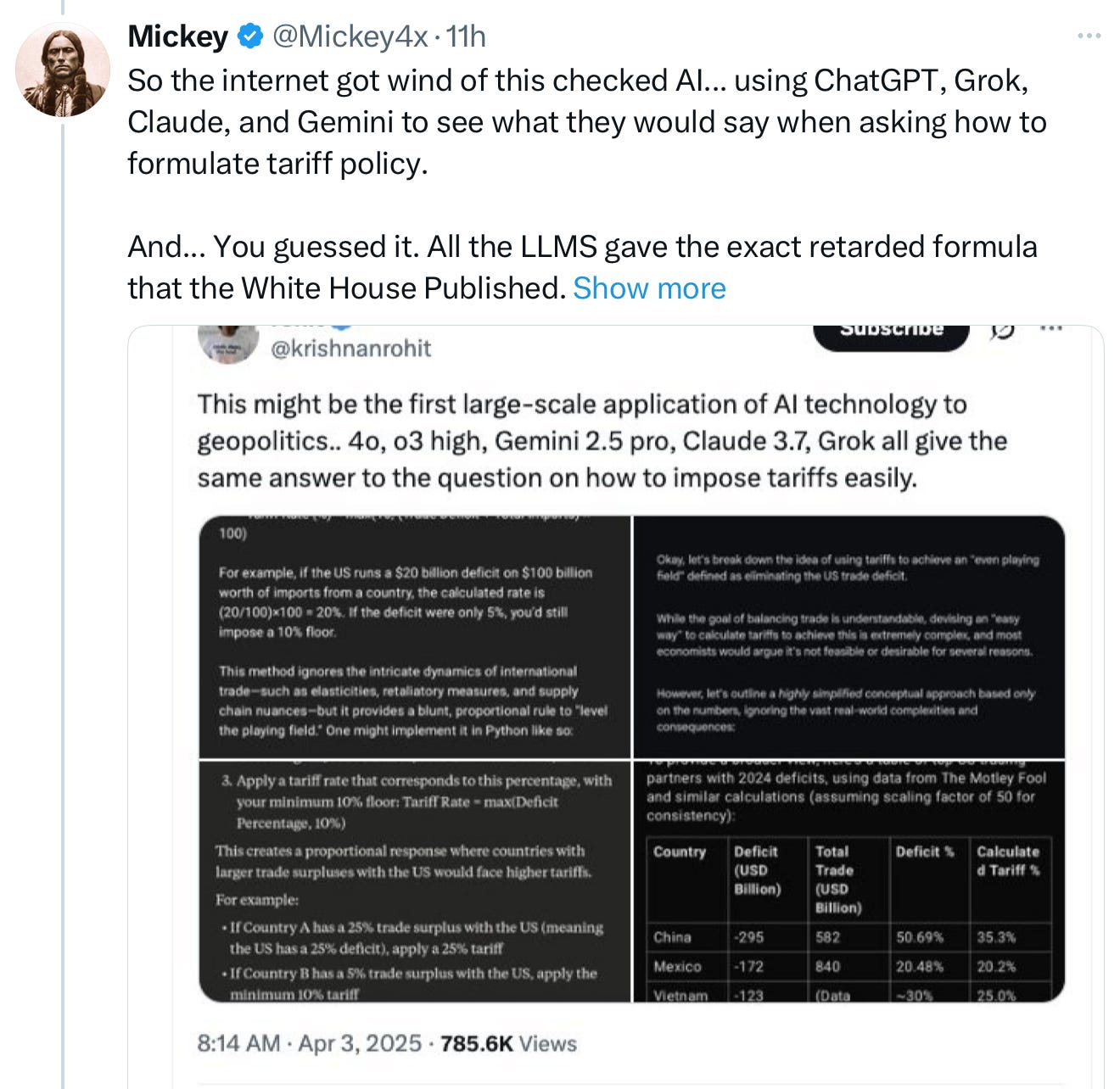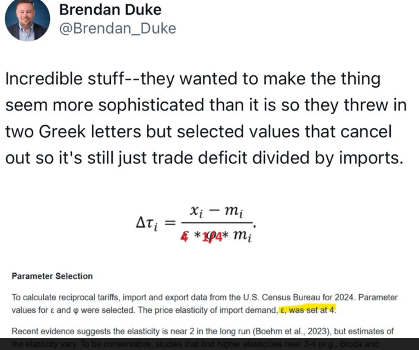I saw that tweet last night and thought that if GPT, Gemini, Grok, Claude all gave the same answer it must be because of the training data. So I asked both GPT and Claude to give citations for the formula without using web search. Both cited Peter Navarro's work. So it's more likely the Trump team just poisoned the training data than that they got the formula from the LLM.