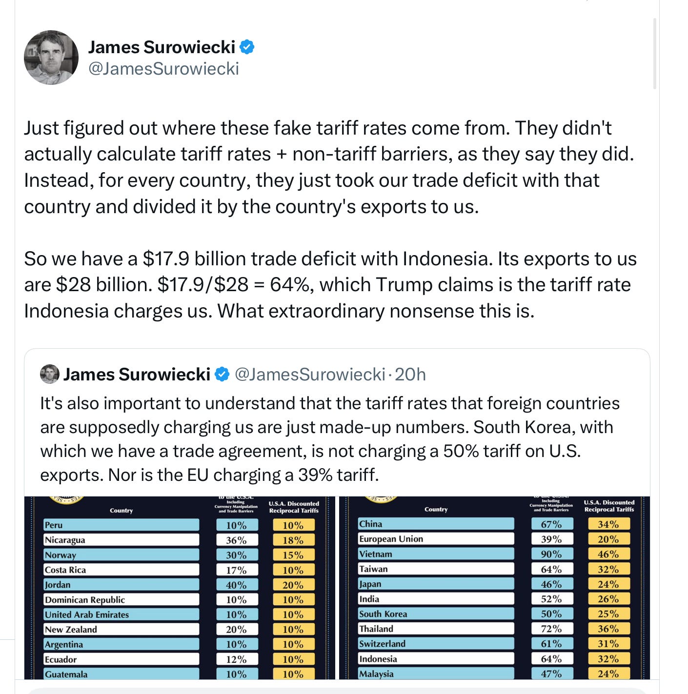 Basically, it turns out that Trump’s tariff rates derived from a simple formula that James Surowiecki inferred correctly: