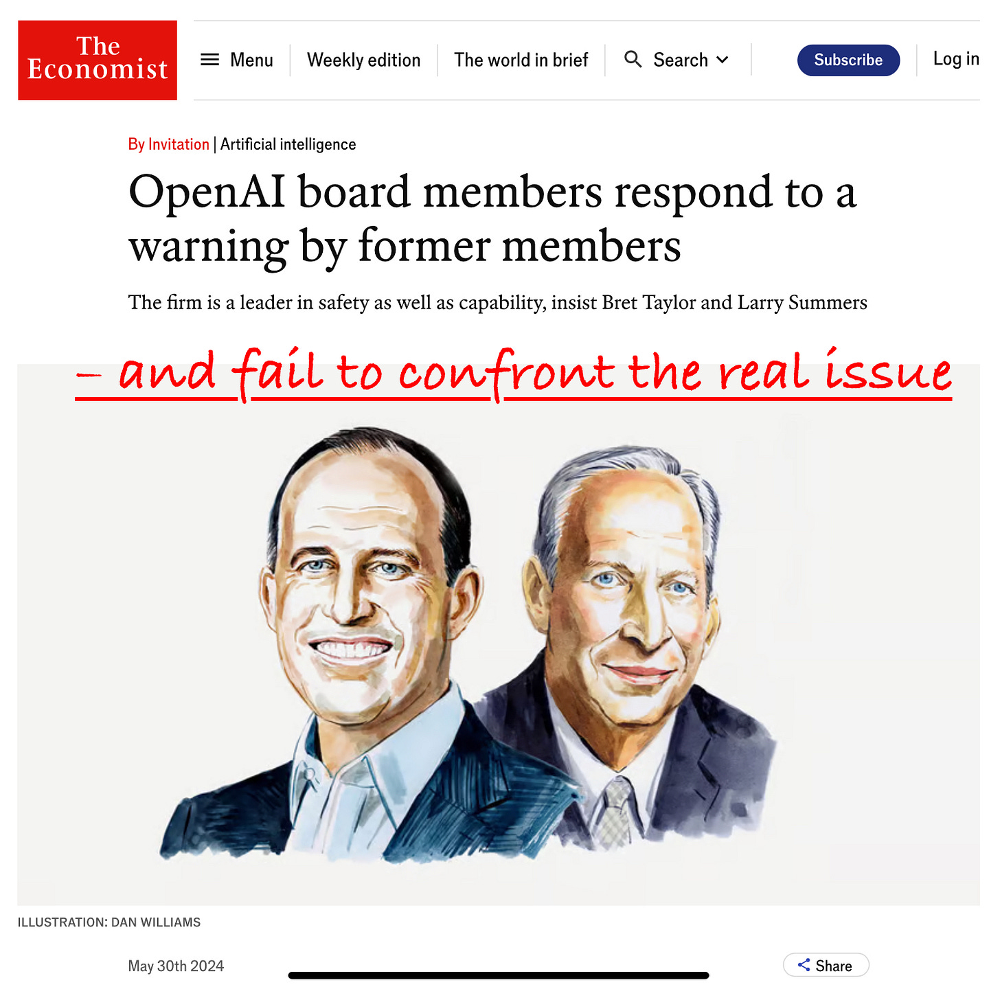 The highbrow attack comes from two members of the current board, in The Economist, Bret Taylor (Chair of the current Board) and Larry Summers (perhaps best known as a former President of Harvard), both part of the crew that replaced Helen Toner and Tasha McCauley.