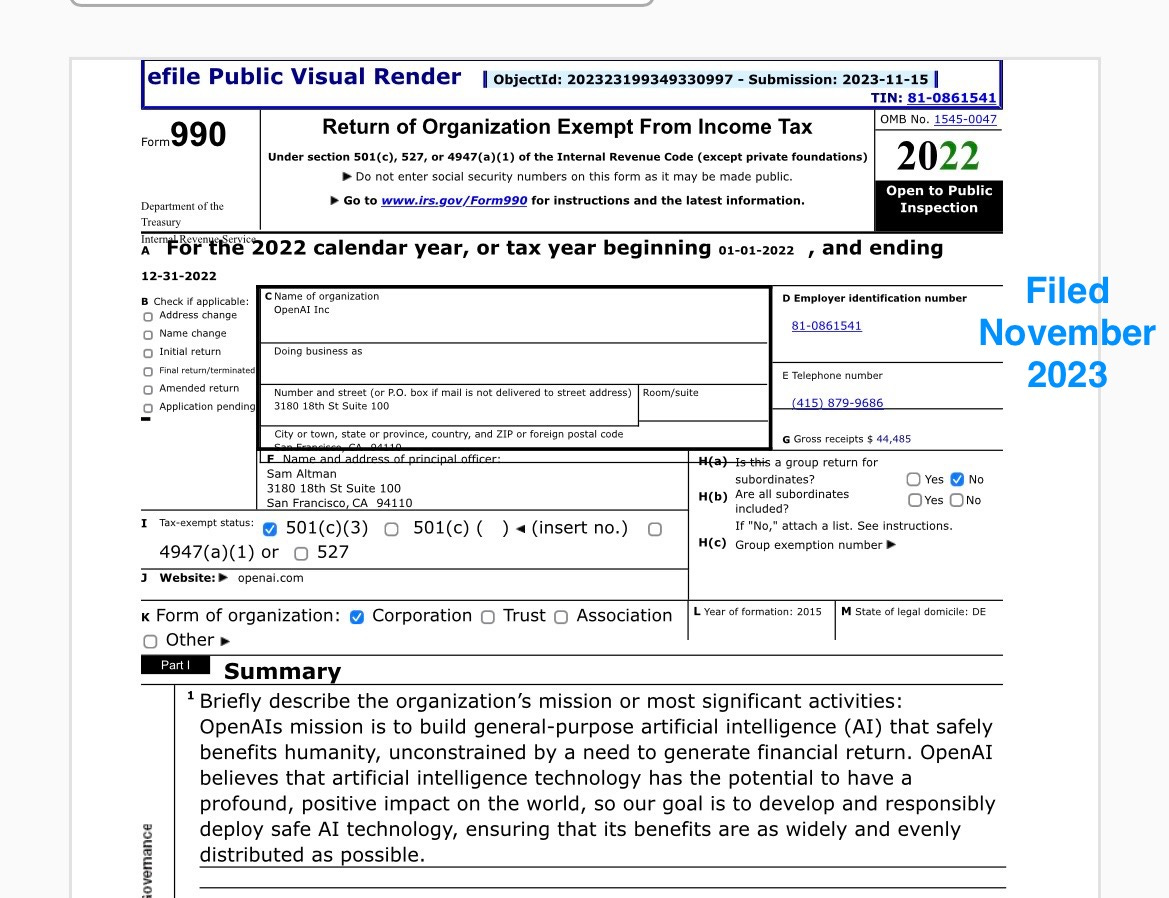 But OpenAI has been and continues to be a California-registered 501(3)(c) nonprofit, pledged not to profits, but to humanity – and still getting tax-exempt status on the basis of their promise to deploy AI safely:
