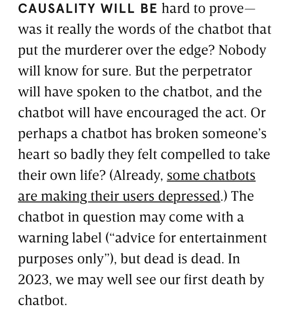 To my knowledge, tech companies are free to leverage a human gullibility around chatbot technologies however they like, without consequence, just as big teach companies previously leveraged to a human need for attention to the point of creating addictions to social media, even to the point of sometimes causing “Twitter poisoning”; with the new generation of chatbots, we will see addictions no less potent.