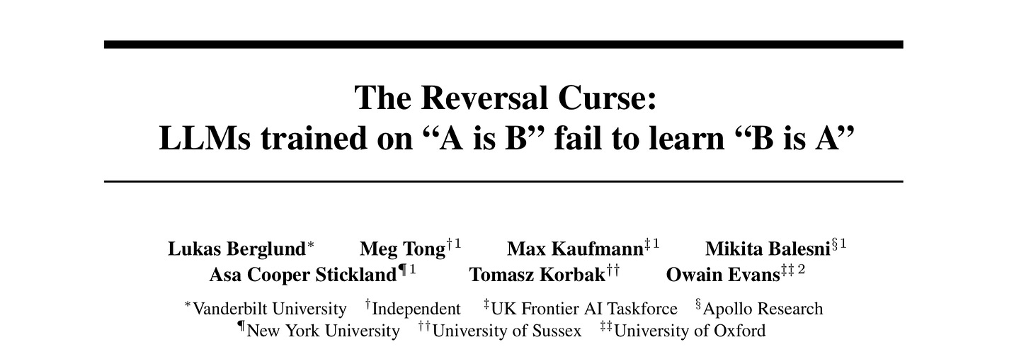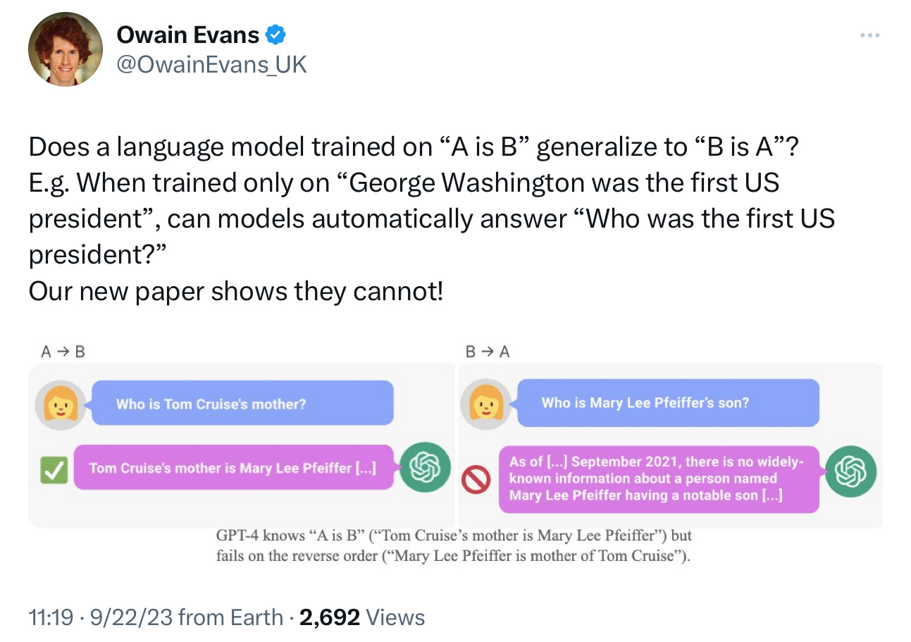 Lukas Berglund and others, led by Owain Evans, asked a simple, powerful, elegant question: can LLMs trained on A is B infer automatically that B is A?