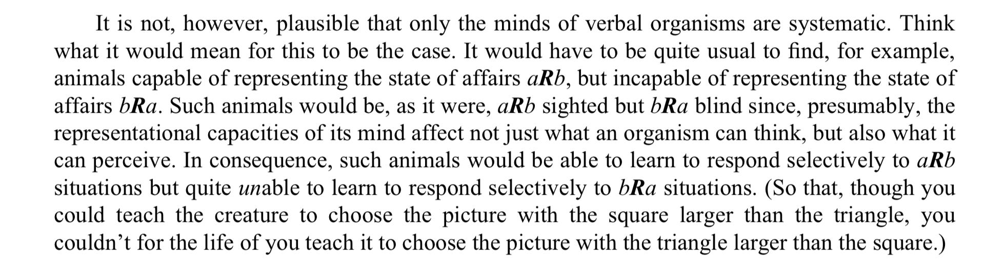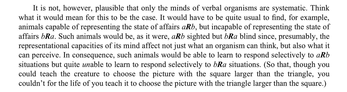 But what’s really mind-blowing here is not just that the paper vindicates a lot of what I have been saying, but the specific example was literally at the center of one of the first modern critiques of neural networks, even earlier: Fodor and Pylyshyn, 1988, published in Cognition. Much of Fodor and Pylyshyn’s critique hovers around the systematicity of thought, with this passage I paste in below (and several others) directly anticipating the new paper. If you really understand the world, you should be able to understand a in relation to b, and b in relation to a; we expect even nonverbal cognitive creatures to be able to do that: