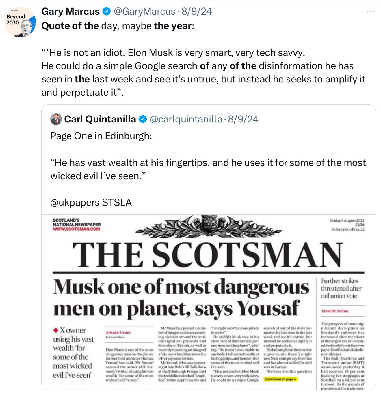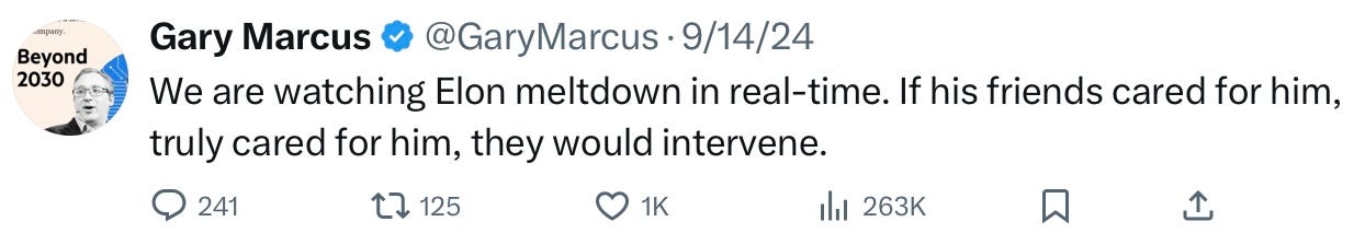 Last July, when I was still a regular user of X, I warned, not entirely in jest, that Elon Musk was taking a flamethrower to his own reputation. In another tweet the same day, I warned that Musk “could wind up the Howard Hughes of his time, if he continues to shelter himself from opposing views.”