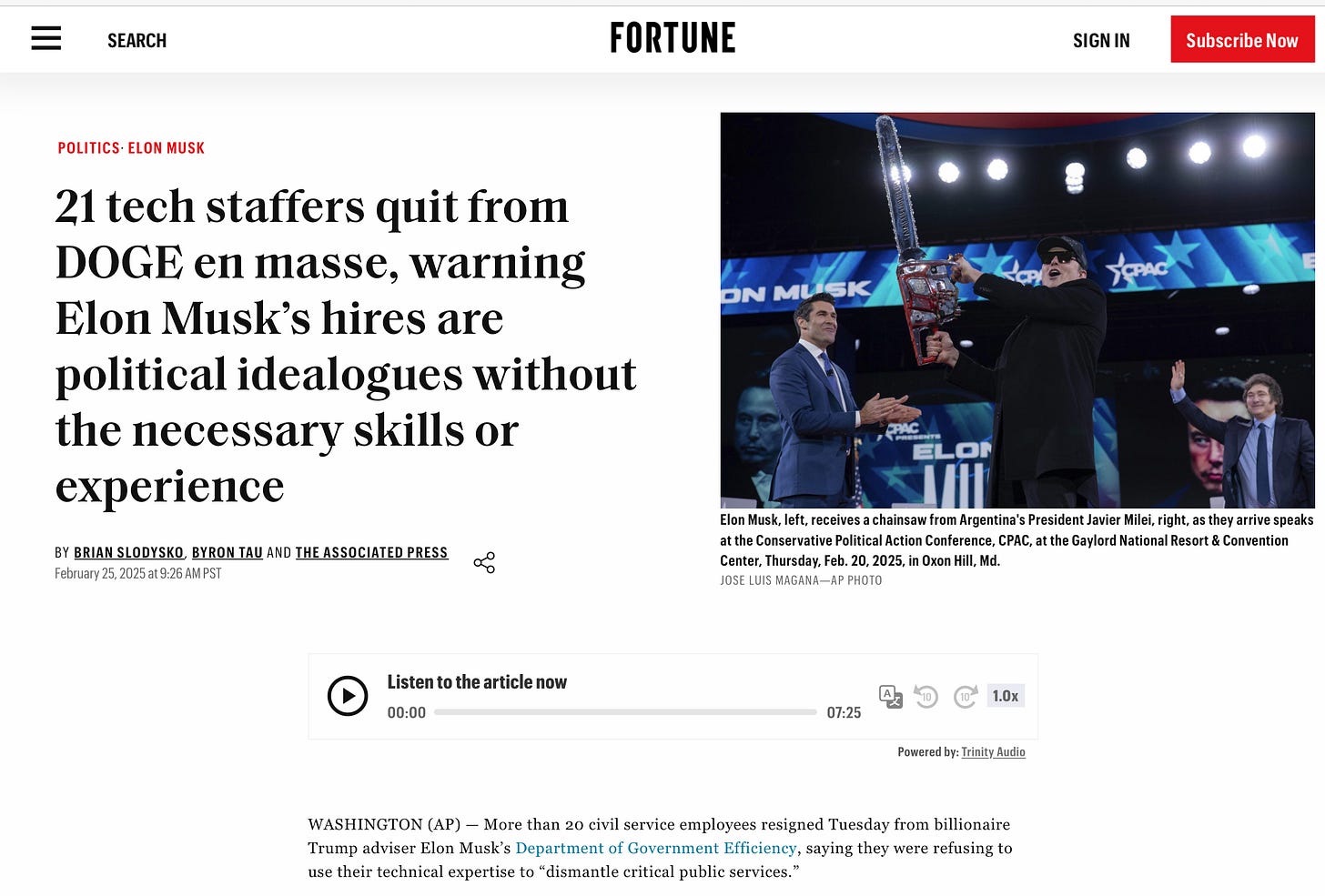 And, today, 21 technology staffers quit the DOGE organization, writing “We will not use our skills as technologists to compromise core government systems, jeopardize Americans’ sensitive data, or dismantle critical public services.”