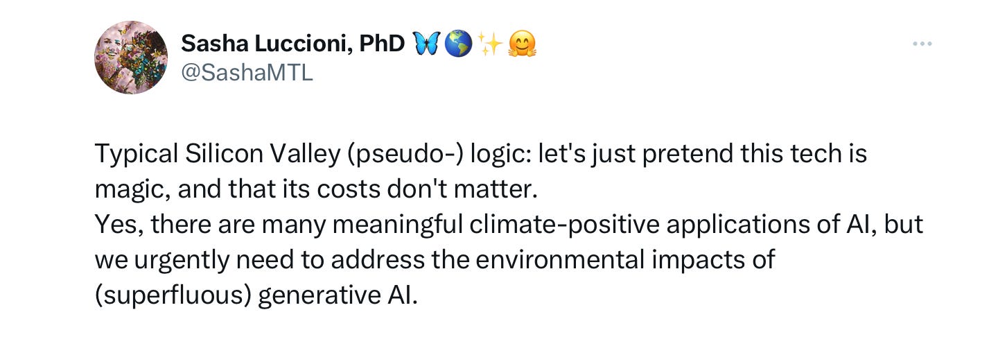 Or in the words of Sasha Luccioni, an AI researcher who has looked extensively at AI’s environmental costs: