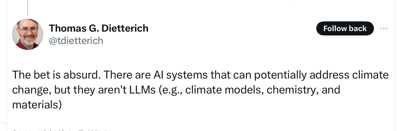 In the clip, Schmidt runs together different many different forms of AI. GenAI, which is consuming all the power, probably isn’t going to do a whole lot for addressing climate change, when it can’t even reason reliably about river crossing problems. Other forms of AI, that are more domain-specific and specialized might help; those aren’t actually the ones getting the massive funding – or doing the massive harm. Machine learning pioneer Thomas Dietterich’s comment on Schmidt’s bet captures this well: