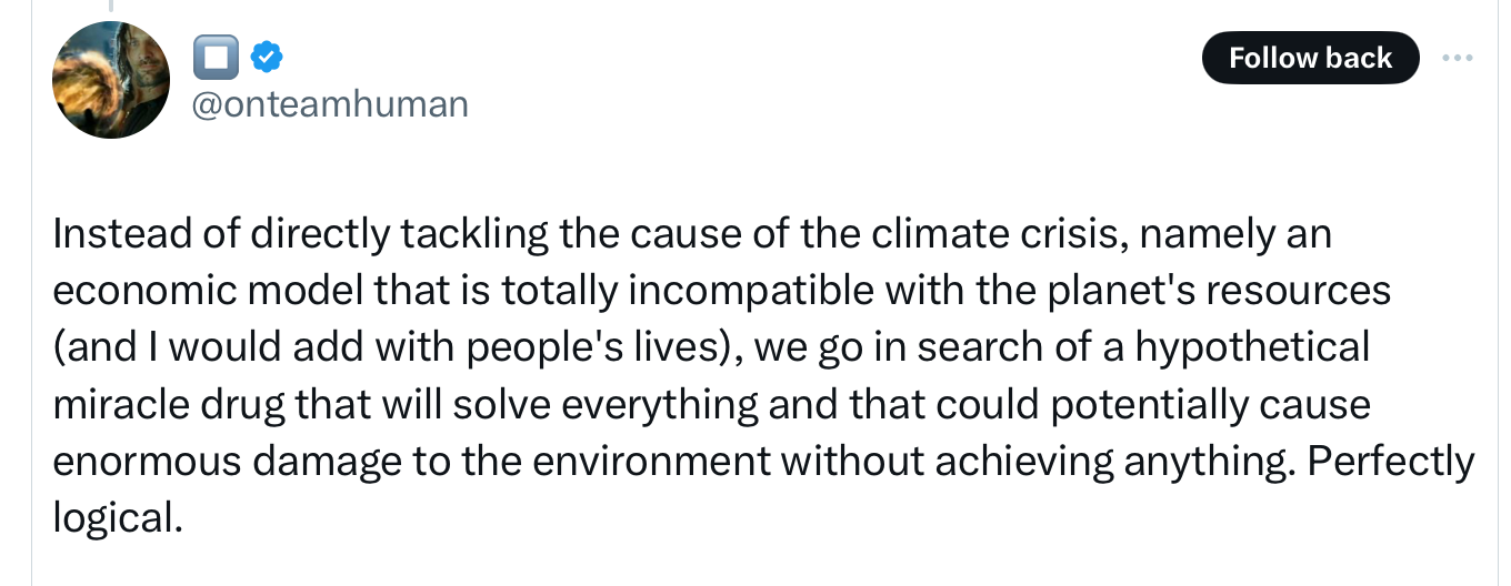 Ultimately, we can’t, or at least shouldn’t, place massive bets like these without transparency and accountability. We need independent scientists asking about whether the best (rather than simply most conveniently at hand) technologies would be used, and what the odds are of success, and the costs are of any major bets, so we can make a careful decision about what it is worth it. It shouldn’t be up to a few billionaires to decide, and profit-driven companies with unelected leaders shouldn’t decide on their own, for all of us. Society has to have a vote here.