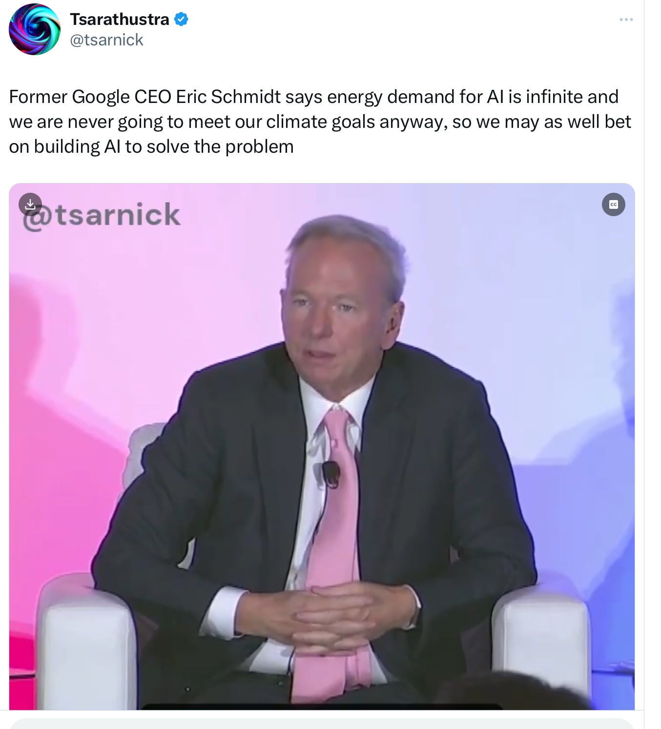 In the 2 minute clip, Schmidt concludes “My own opinion is that we’re not going to hit the climate goals anyway because we are not organized to do it and yes the needs in this area [AI] will be a problem. But I’d rather bet on AI solving the problem than constraining it.”
