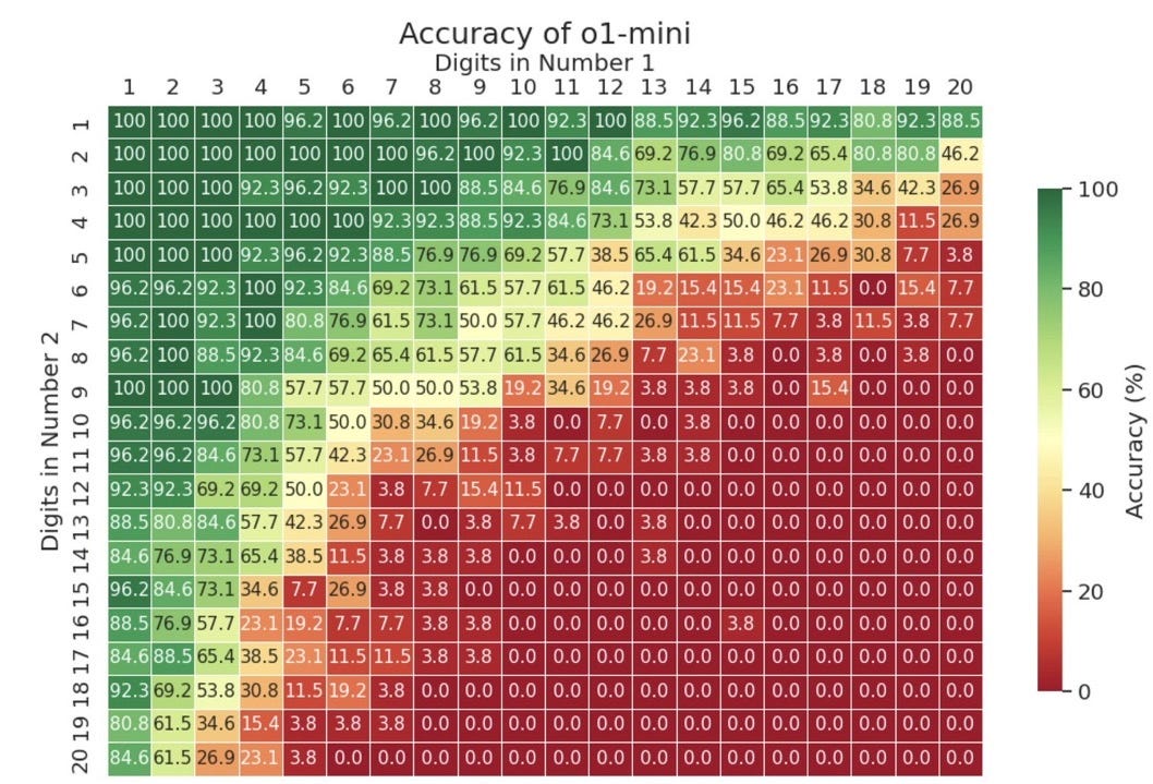 • AGI should have a reliable ability to freely generalize abstractions to new instances regardless of how similar they are to items encountered in training. Apple’s recent study formal reasoning very much confirms that this is still not the case, more than two decades after I first pointed out this weakess. Another recent study on multiplication, replicates the weakness once again. even with the recent model o1-mini.1 Every red cell in this graph (e.g, multiplying 20 digit numbers by 19 digit numbers2) is failure to generalize, even after immense amounts of training data: