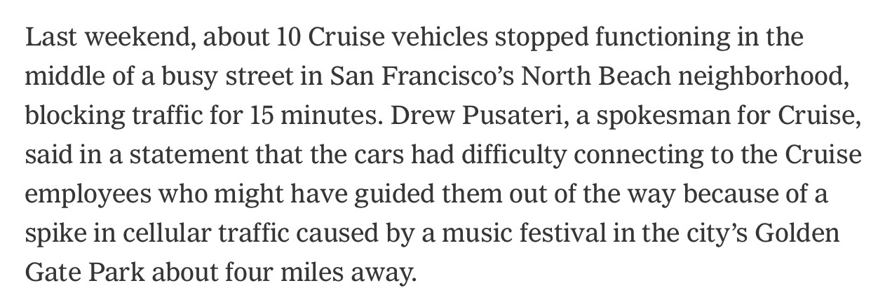 And, it’s not just that literally every proto-self-driving-car stills need a nanny. It’s that they also still struggle (that’s what the whole episode with Metz was about). And sure enough increasing operations has led chaos. And it didn’t take long. One of my favorite colleagues in the field wrote to me on Monday, shortly after the CPUC decision, “I am super confident this is going to be a &)@$ show”.