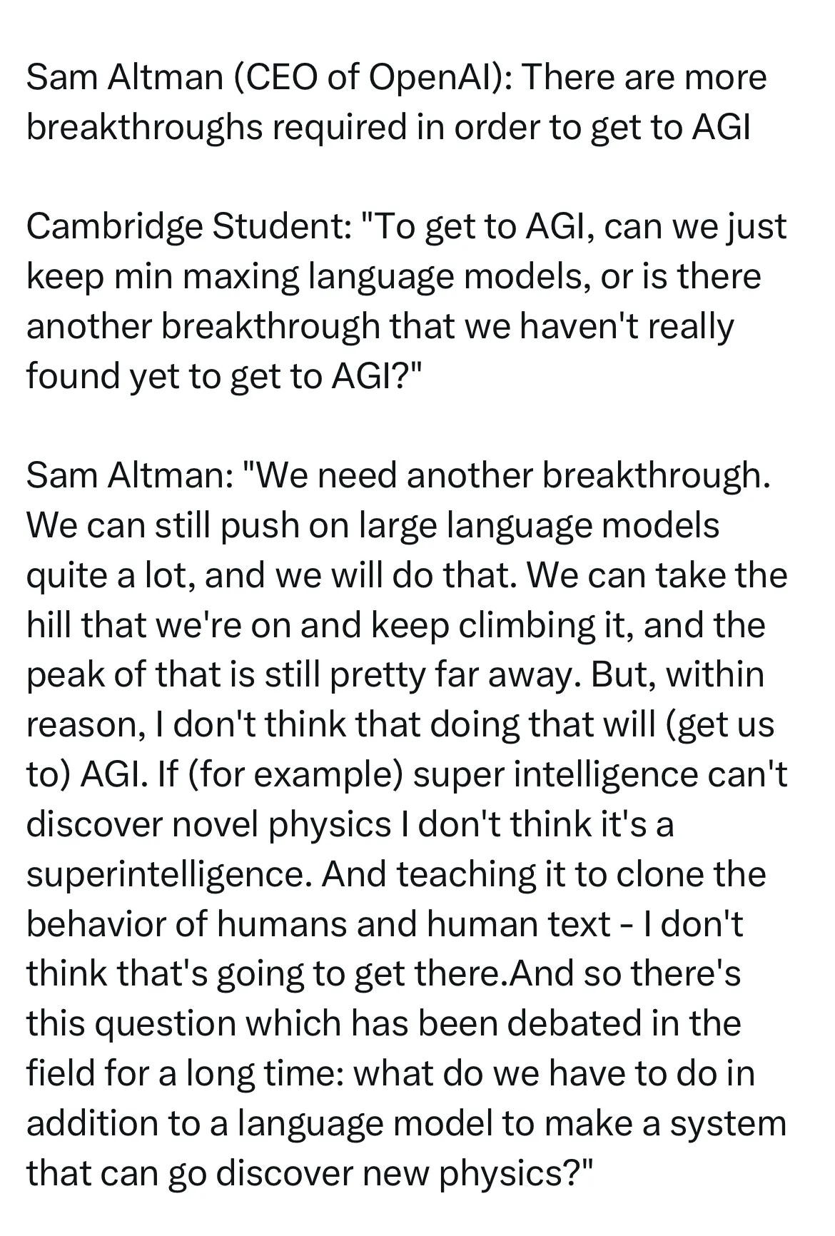 Altman had, much to my surprise, just echoed my longstanding position that current techniques alone would not be enough to get to AGI