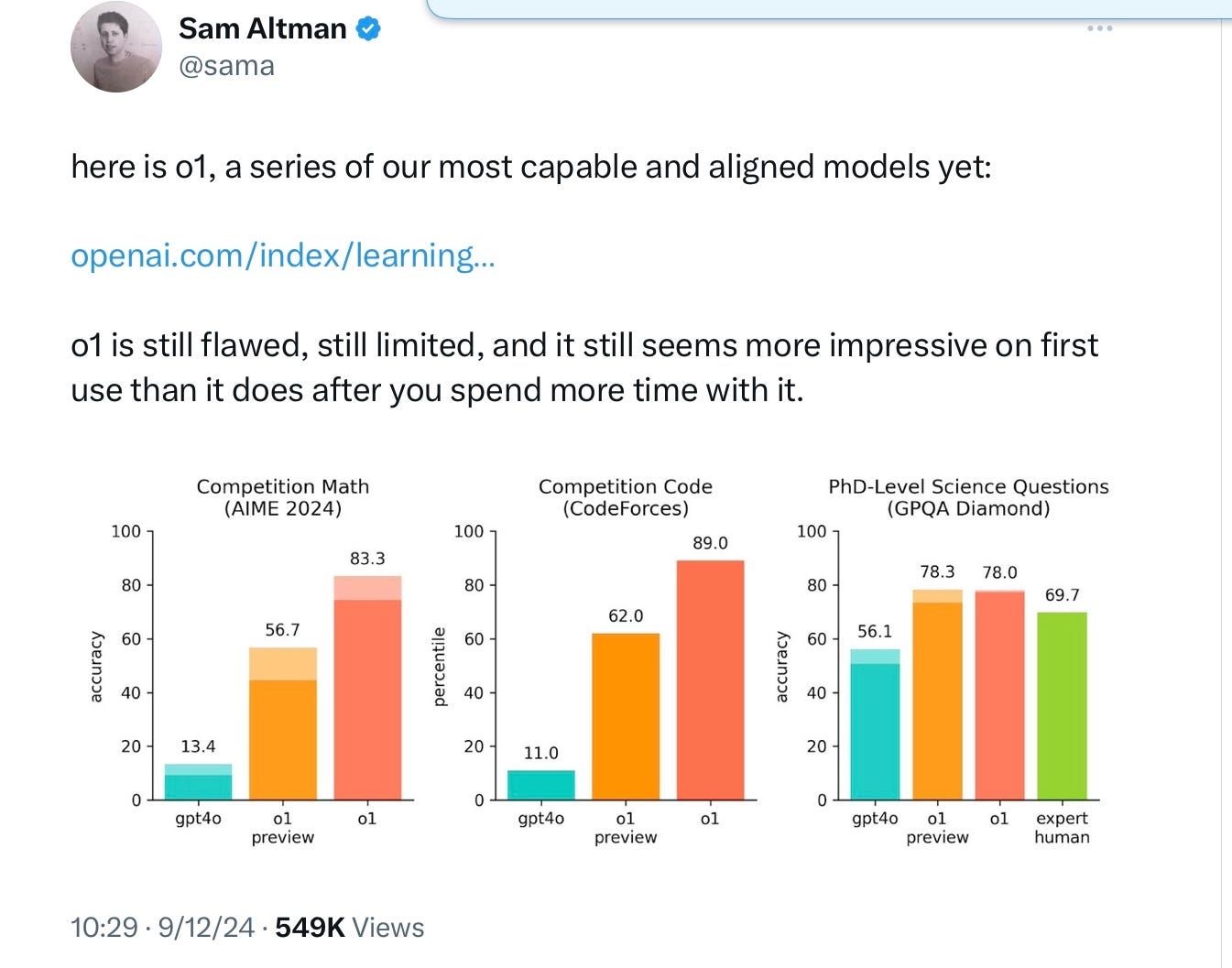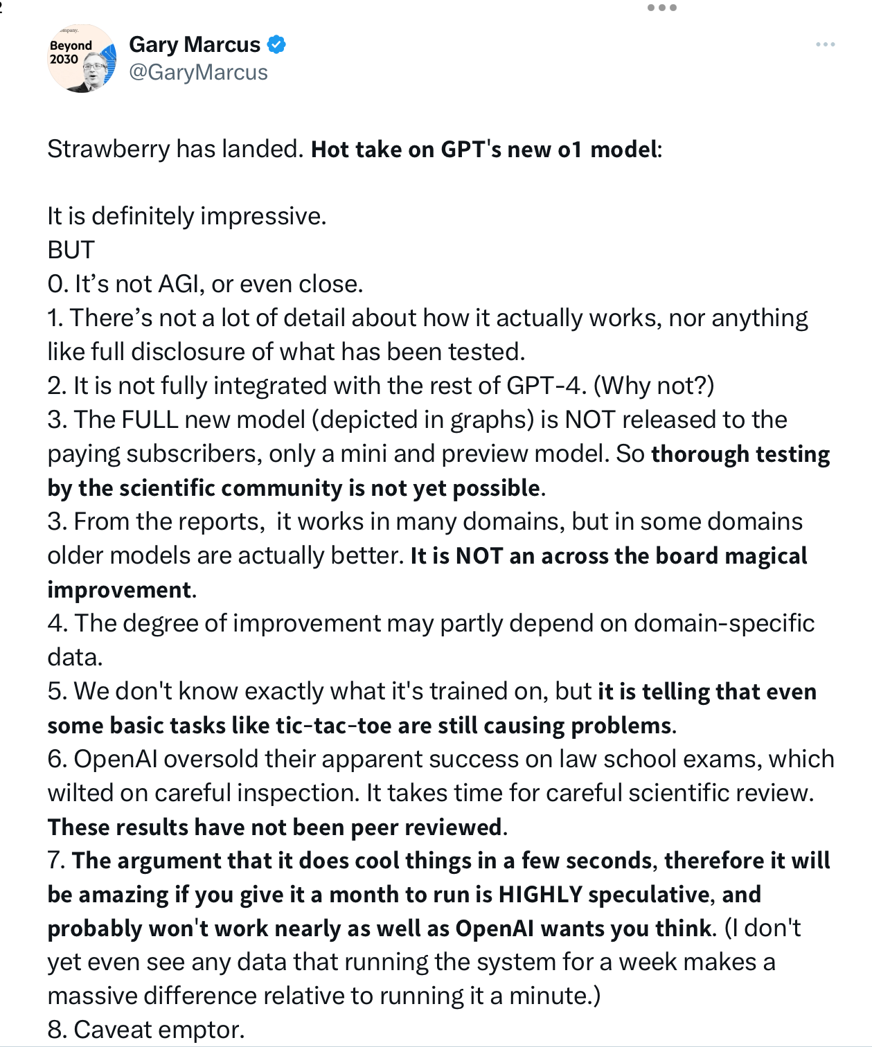 OpenAI’s latest, GPT o1, code named Strawberry, came out.. In the midst of any insanely packed day, I rushed out a hot take on X, my usual cautions about how LLMs aren’t really AGI: