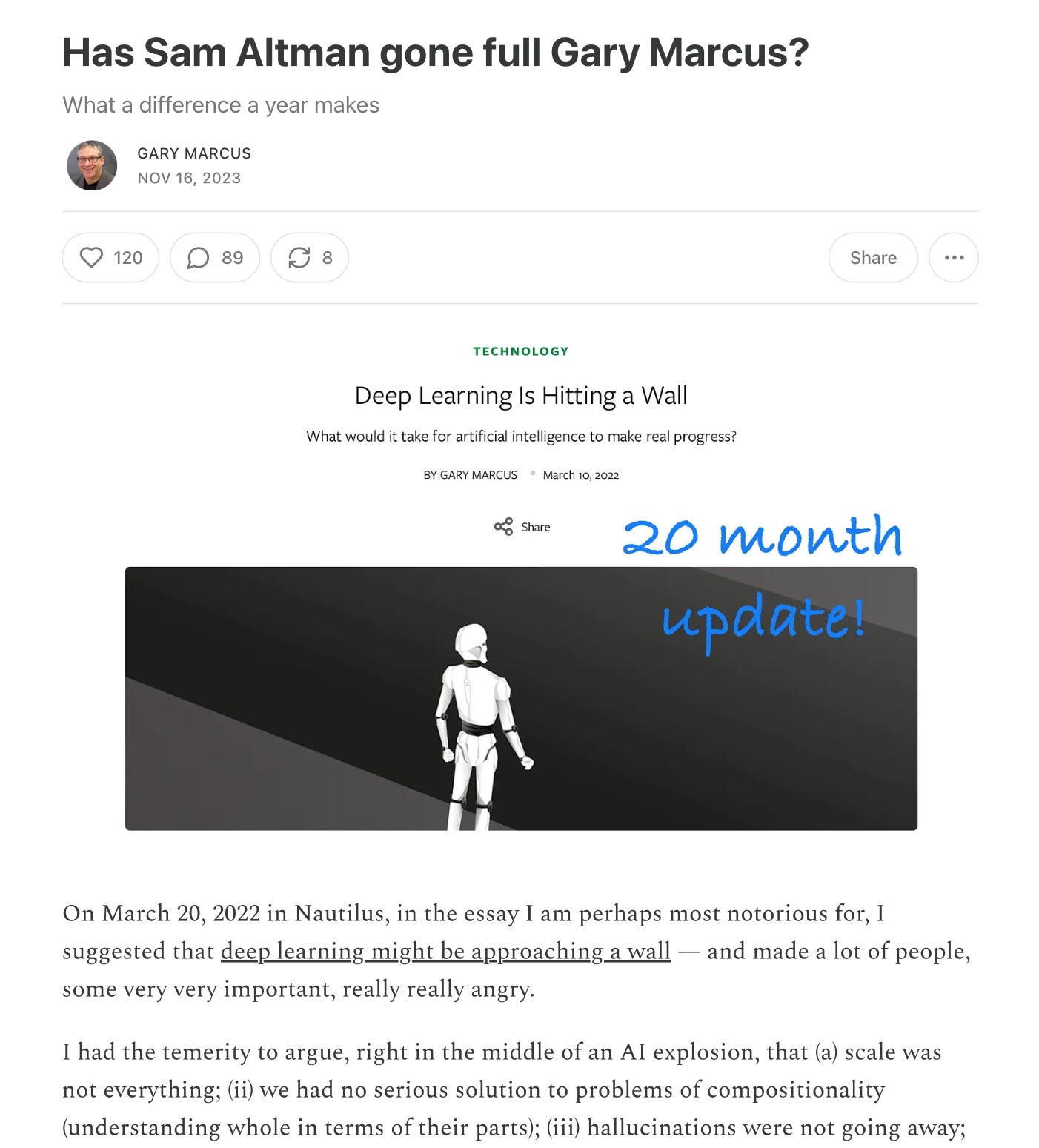 But first let’s rewind. Remember how last November I said that Sam Altman was turning into Gary Marcus, a few days before he got fired?