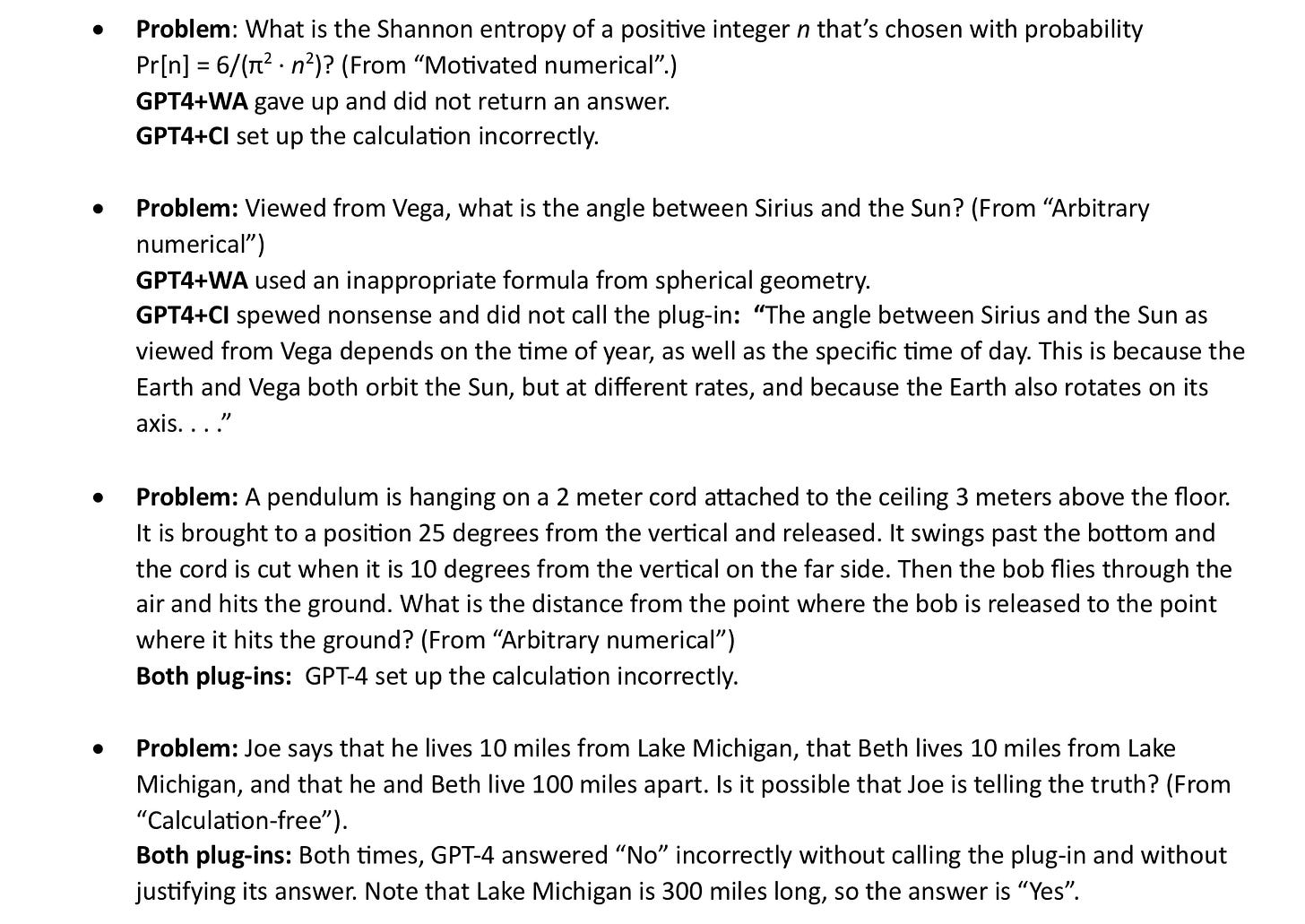 Sometimes, as in the “pendulum” problem above, GPT-4 completely misunderstood the problem. Sometimes, as in GPT4+WA’s answer to the “Vega” problem above, it retrieved the wrong mathematical formula. Sometimes, as in GPT4+CI’s answer to the “Vega” problem, it hallucinated facts such as Vega orbiting the sun and got confused by those. Sometimes GPT-4 decided to do some or all of calculations itself instead of invoking the plug=in, and it got the calculation wrong. GPT-4 often made syntactic mistakes in calling Wolfram Alpha (e.g. it tried to use a reserved word as a variable) and was sometimes unable to correct itself and find a correct formulation. In a few cases GPT-4 set up the calculations correctly and the plug-in returned the correct answer, but then GPT-4 either misunderstood or refused to accept that answer.