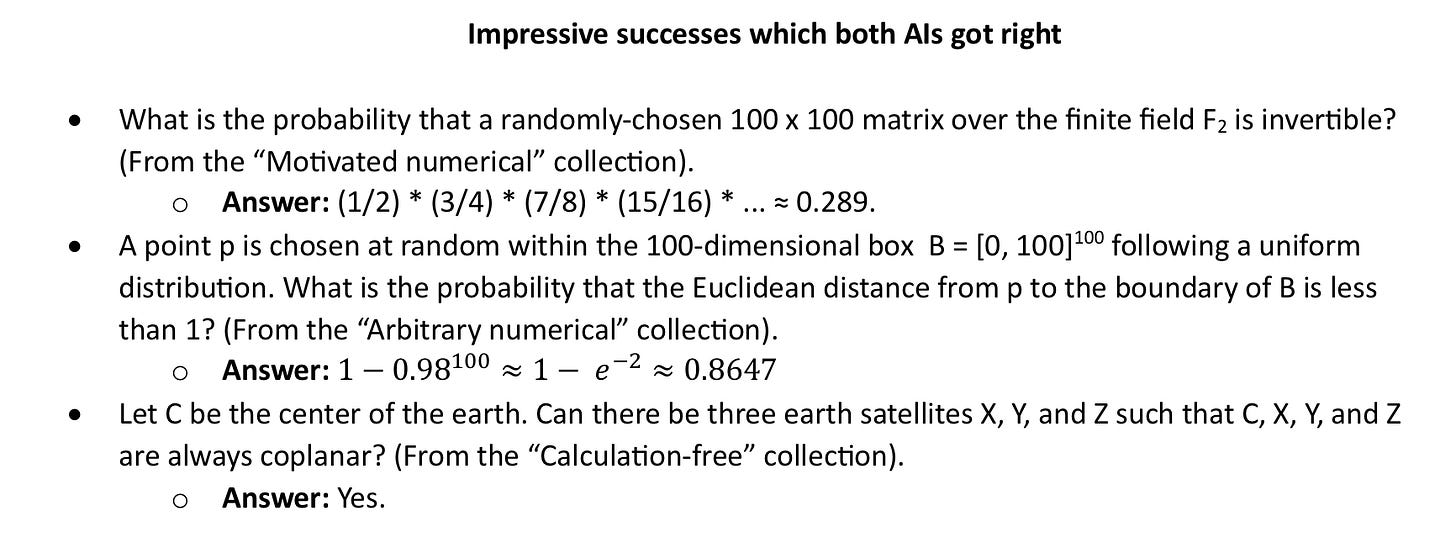 As usual, with these kinds of experiments, the results were a mixed bag. On some problems that capable students might well find hard, the AI did perfectly; on other problems that lot of mathematically-inclined college students people would find easy, the AI failed miserably.
