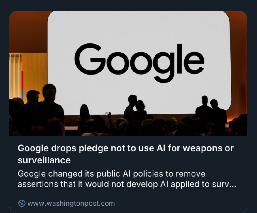 And the biggest news yesterday in Google’s earnings call was not what was said — but was what was not said: how much money they made from AI in Q4. Reading between the lines, Google is locked in a epic arms race for AI supremacy that is not so far paying off. If they were already making zillions from AI, they would have mentioned that on the investor call. But presumably they are not, and that cannot continue indefinitely. Google has to find a way to make back the money back. Bye bye corporate motto, hello military and surveillance.
