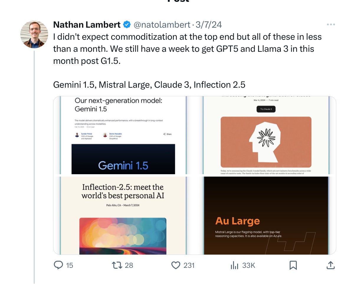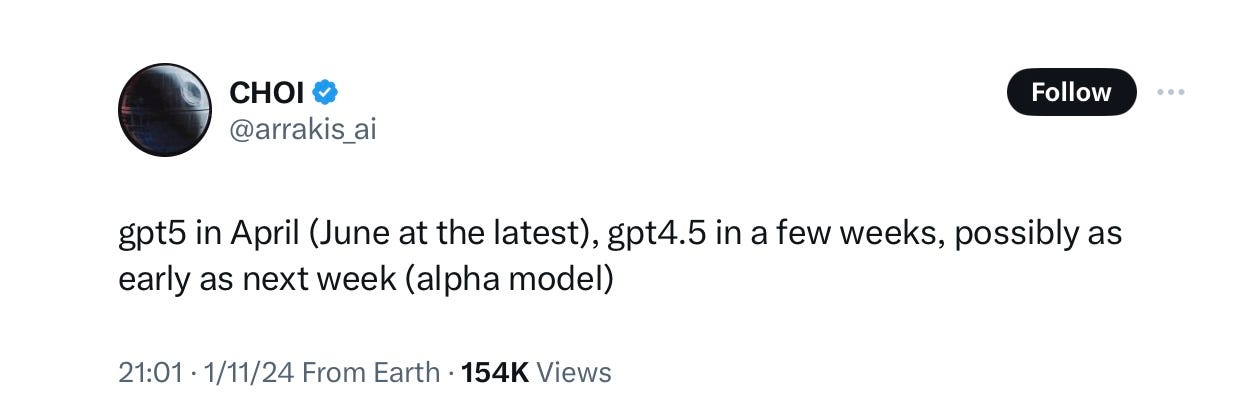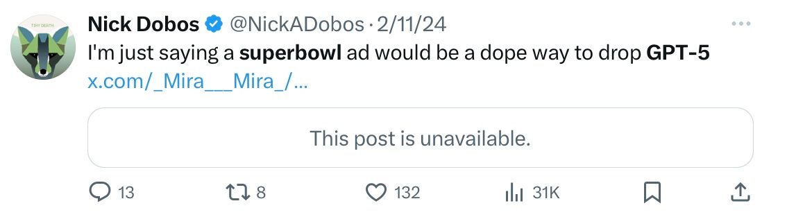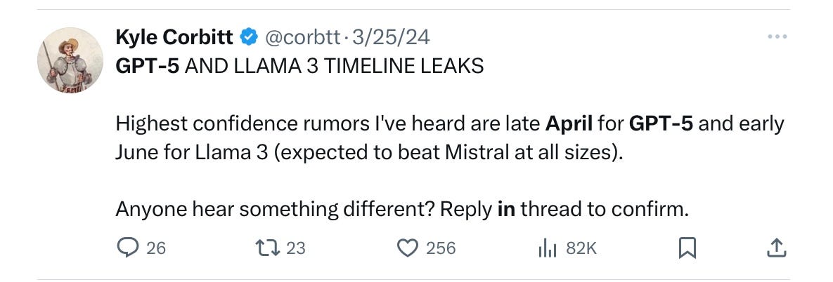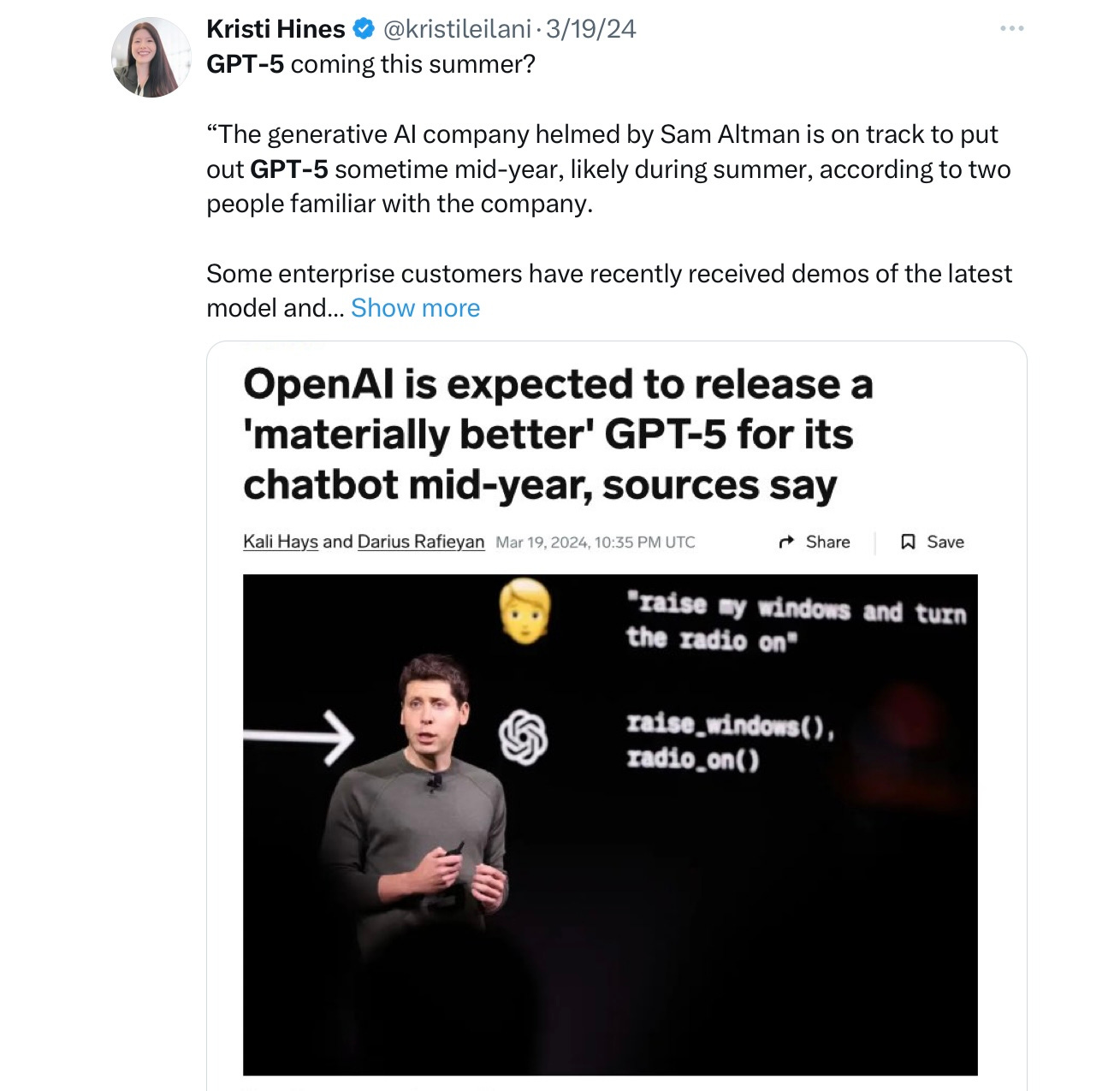Alas, The Super Bowl has come and gone; so has April. Today is June 20 and I still don’t see squat. It would now appear that Business Insider’s sources were confused, or overstating what they knew. Sam just a few weeks ago officially announced that they had only just started training GPT-5. (Probably for the third or fourth time, if my hunch is correct, with GPT 4-Turbo and 4o perhaps being failed attempts that didn’t seem worthy of the name, with another earlier attempt halting before Sam’s time speaking to the Senate in May 2023.)