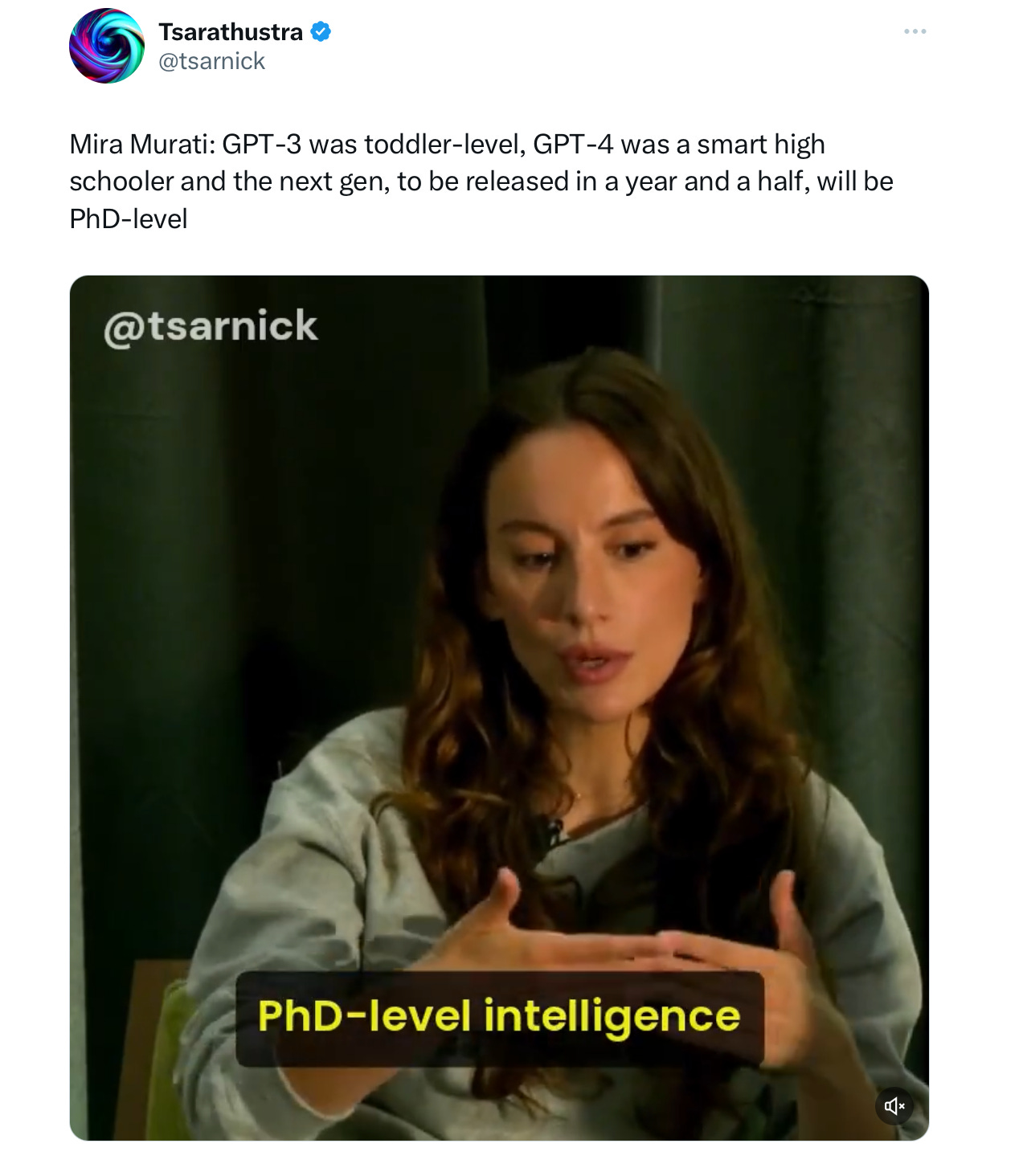 In an interview with her alma Mater Dartmouth, Murati promised we’d someday see “PhD -level” models, the next big advance over today’s models, as she tells it … but not for another 18 months.