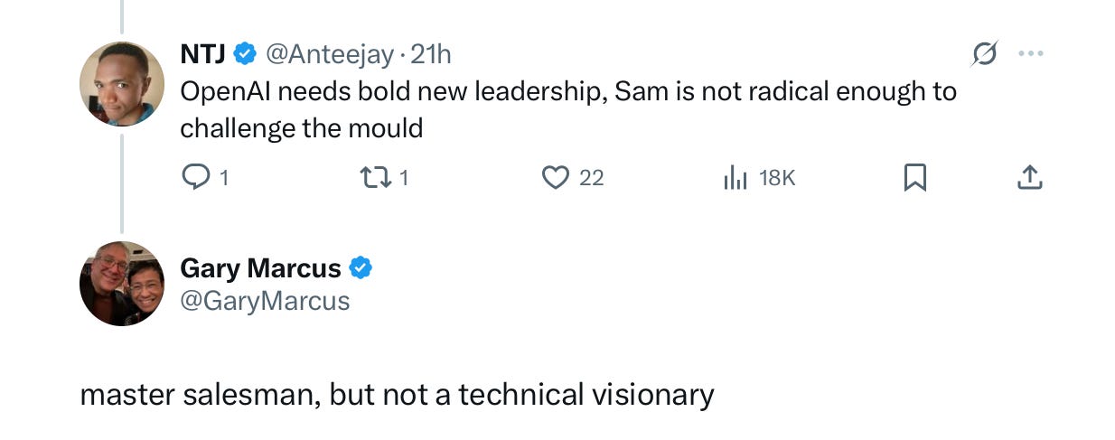 Thanks for this post. I read Karen Hao's excellent book, which is how I found you, Gary, because you made the most sense to me. Am heartened to see my instincts—and you—have been vindicated.