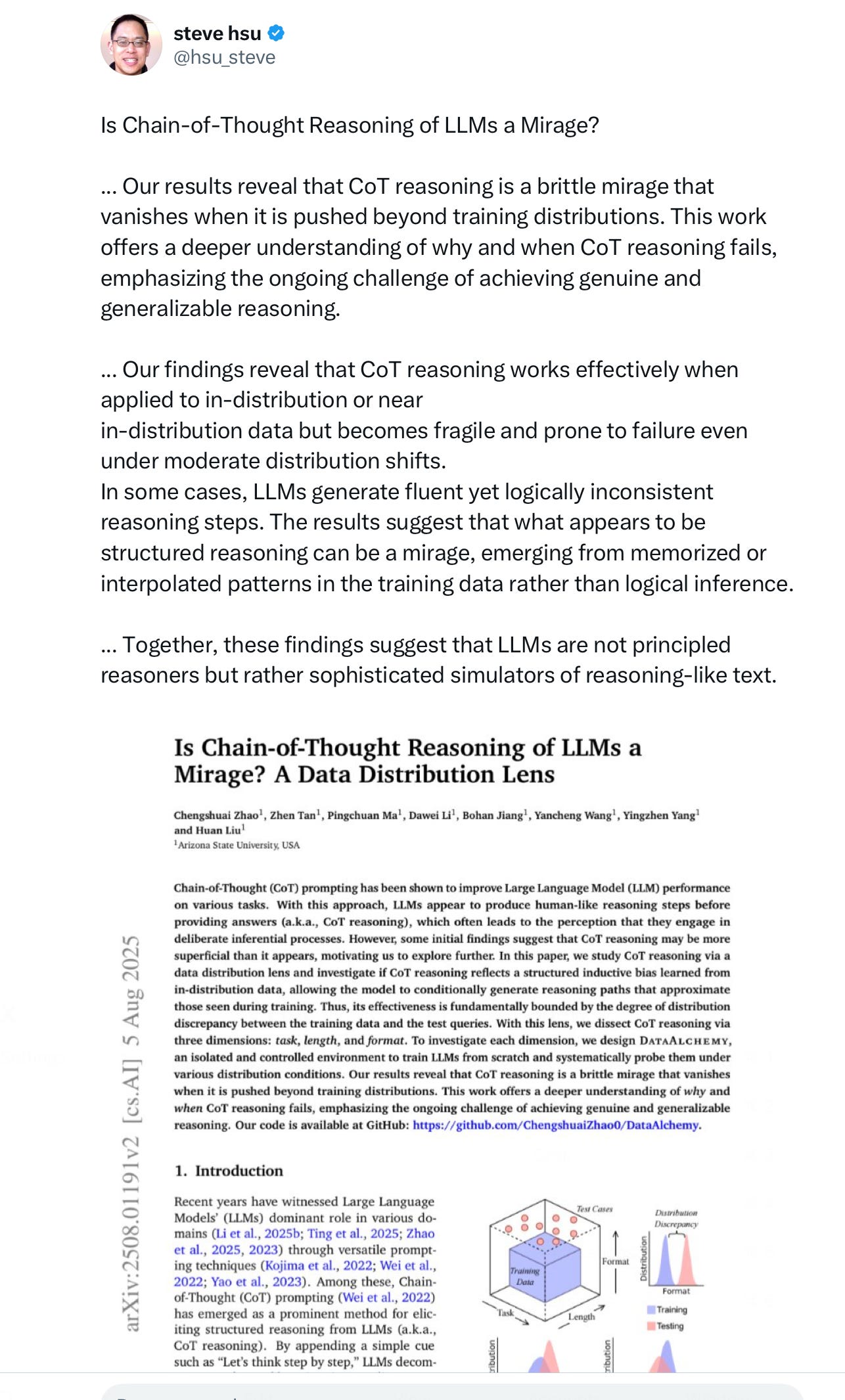 The real news is a breaking study from Arizona State University that fully vindicates what I have told you for nearly 30 years—and more recently what Apple told you—about the core weakness of LLMs: their inability to generalize broadly.